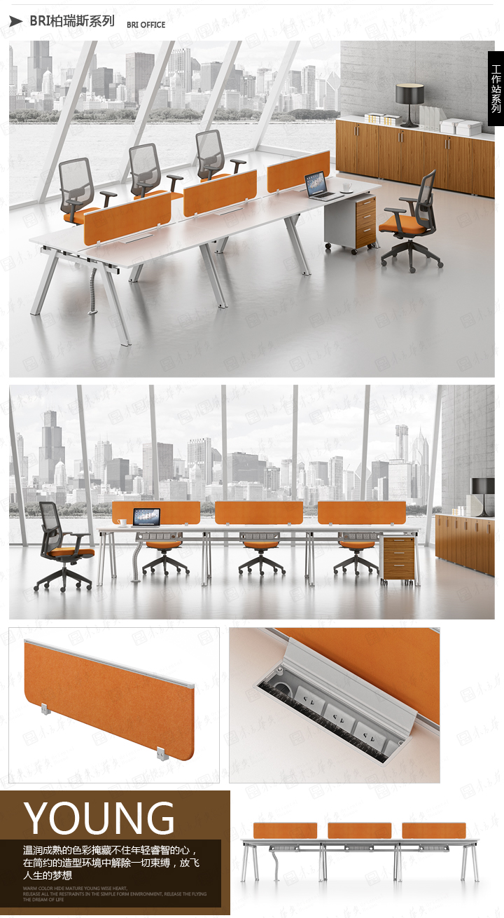 现代办公追求新的工作模式,开放式简约型的办公空间是年轻一代的追求,其中色彩扮演着很重要的角色,靓丽的色彩更能调动气氛。东方华奥潜心研究开发和主导整体的现代简约办公家具。柏瑞斯系列,在设计上承袭简约主义的精神内涵,以简练的线面构成营造一个单纯与干净的办公生活环境,表现出独特的纯净与凝练,营造出一个设计韵味机枪的办公环境。同时,柏瑞斯以温暖的阳光色调为主要基调,橙色宣扬一种阳光活力的精神,活泼、迷人中带有一点点现代与浪漫的碰撞后产生的时