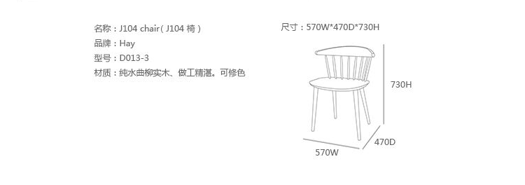 J104是由Poul M.Volther在50代所设计的三脚单椅,使用山毛榉原木制造,另有四种不同色彩黑、灰、白、珊瑚红可供选择。隶属于FDB系列的J104单椅,是HAY在 2011年推出丹麦精典家具复刻版系列之一,当年原本是为丹麦消费者合作社(FDB)所设计的产品。兼具实用和自由设计的概念,就是40年代FDB的家具产品核心概念,藉由规模性的生产,降低成本,FDB系列让设计家具在当时的丹麦不再那么高不可攀的遥远,FDB系列不但价格亲民,同时兼顾制造的高质量,风味独具的设计更是历久不衰。经典的温莎式造型 (Windsor style),可以说是FDB系列单椅 - J77/J104/J107/J110共同的设计DNA,全木制的FDB系列单椅,椅背由多根直棂构成,通透利落的造型,带出有别于其他单椅的强烈视觉效果,通透的靠背设计,也让整体造型变得轻盈,但底部三只旋木椅脚由上至下向外倾斜挺立,具有轻巧而稳重的视觉效果。J104是FDB系列当中,唯一的一张三角单椅,并且有着造型别树一帜的三角椅面,体积较小却又舒适无比的J104不但适合商业空间或较小的居家空间使用,也适合与其他FDB系列单椅相互混搭,营造高低的层次效果。数十年过后,HAY决定重新生产的 FDB 系列,除了立基于HAY的品牌精神-期许让丹麦家具设计回归50、60年代的创新思考模式,并赋予崭新的当代内涵。也将FDB系列的经典延续,并且推广至全世界,让世人都能回顾,并且享受型能兼具的FDB。