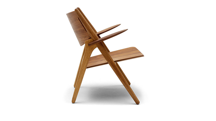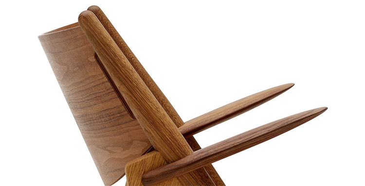 "Hans Easy Chair(汉斯简易椅)设计于1952年,2007年重新生产,是Hans J. Wegner的杰作之一。椅子的独特的造型腿形也是它最鲜明的特点。另外宽阔的扶手和较低的座板靠背都增加了这把椅子的舒适性。椅子可提供纯水曲柳实木框架、靠背曲木弯板版,也可添加织物或皮革坐垫及靠背。"
