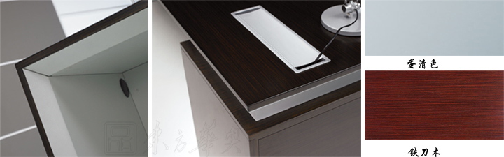 ※ 上图为班台类似款式推荐,选用20MM深邃细纹特质的铁刀木台面,辅以斜边青灰色砂纹台托,在转角内收处形成具有锐利风格的棱边,凸显简约风格!