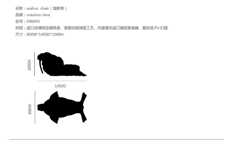 西班牙设计师 Maximo Riera 设计了一组包括章鱼、犀牛、海象、狮子等在内的 15 件动物造型座椅系列皮椅。这个系列的动物椅集合了不同的物种,从哺乳动物到爬行动物,甚至包括昆虫。每个设计都保留了动物的自然活力,同时又准确还原动物的外观特征。这些动物椅的初衷是一种尝试,希望以动物的栖息来反映和捕捉大自然的美,并向我们星球上的整个动物王国致敬。设计师除了表现动物的野性美,也在善意的提醒人们要维持生态的平衡,尤其对濒危物种多加关注,以实现人与自然的相互依赖和谐共存。Walrus Chair(海象椅)是他之前一个系列家具作品的延续。这一系列作品将家具和动物结合到一起,每件家具的主要部件都装饰有一种动物。