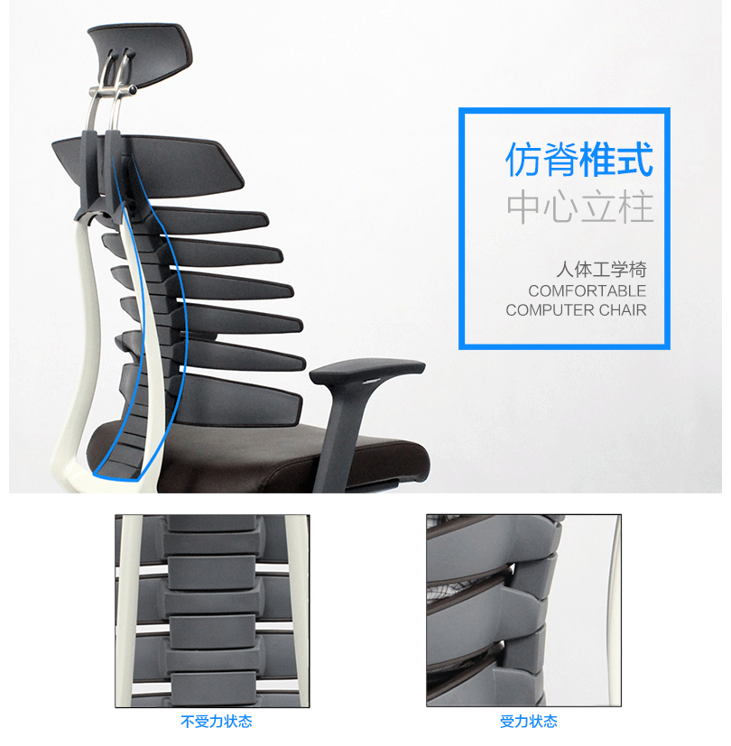 龙骨椅模拟人体脊椎骨造型及特点,并运用贴合返回技术,使座椅自动贴合背部。龙骨椅是一款符合人体工学的全功能性办公椅,力求使用者能充分理解其人性化的设计及达到最舒适的调节。