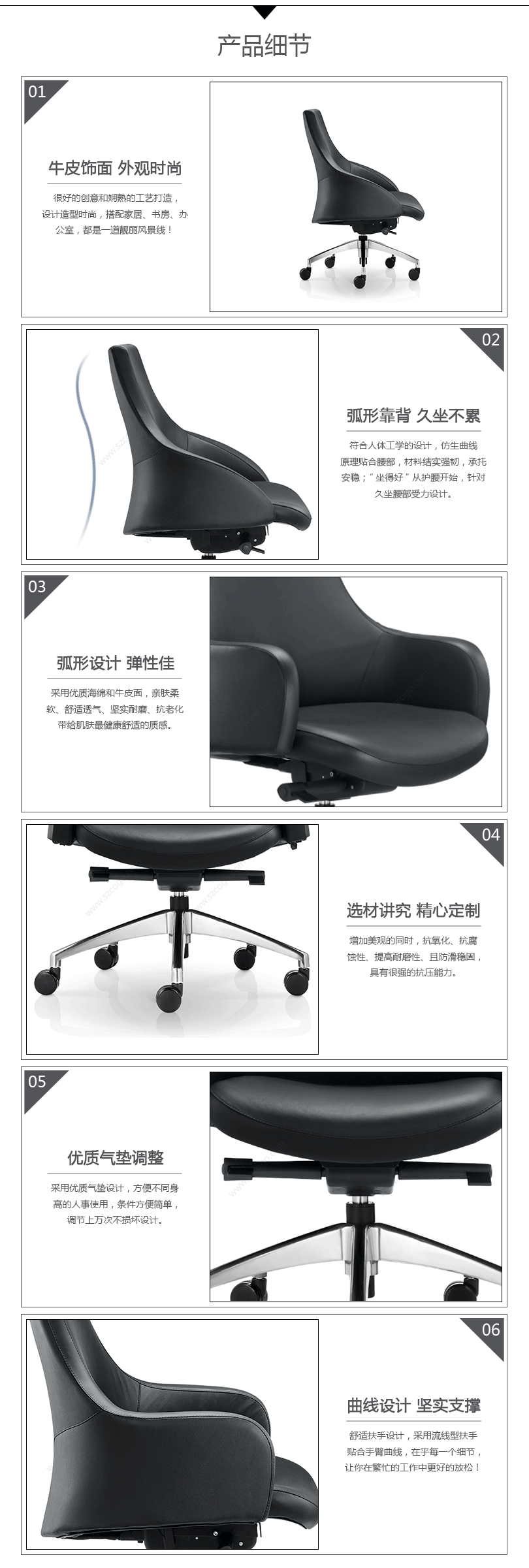 符合人体工学的设计,仿生曲线原理贴合腰部,材料结实强韧,承托安稳;“坐得好”从护腰开始,针对久坐腰部受力设计。"