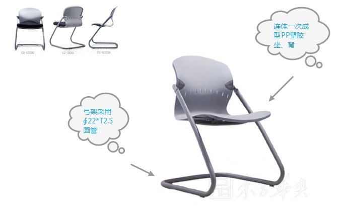 A:连体一次成型PP塑胶坐、背。B:弓架采用∮22*T2.5圆管。