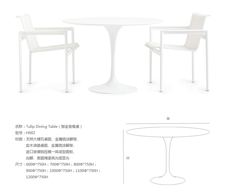 Tulip Dining Table(郁金香餐桌)是芬兰裔美国设计师Eero Saarinen在1956年设计的作品。优雅、清秀的桌脚配上天然的大理石桌面,极简却又完美。Tulip Dining Table(郁金香餐桌)是现代餐桌的代表作,作为家庭中使用餐桌、高档饭店中的餐桌和酒店中使用的餐桌都非常合适。作为著名家具设计师设计的作品设计品位自然不会低,这种餐桌设计出来的时候就被广泛的运用到了饭店、酒店和家庭中,成为当时最热销的餐桌之一,餐桌主要材料是玻璃钢(可选大理石),整张桌子是采用一次成型,中途不会出现裂缝,有质量保障,桌面平滑不会凹凸。