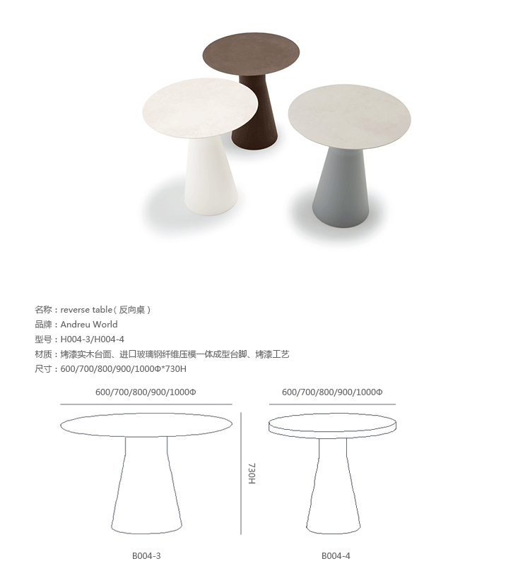 Reverse是一桌子系列,其基础是一中心轴柱,由100%可回收的聚乙烯制成。Reverse Table (反向桌)是这一系列之一,由意大利设计师Piergiorgio Cazzaniga设计的。Reverse的标志性特点是其优雅和结构稳定中心轴柱,使其能够强有力的结合顶部饰面和外观。桌子可提供不同的宽度和高度,使其能够适用在会议及日常等各种场所,桌子可以有六种不同的颜色可选,或者进行哑光处理。