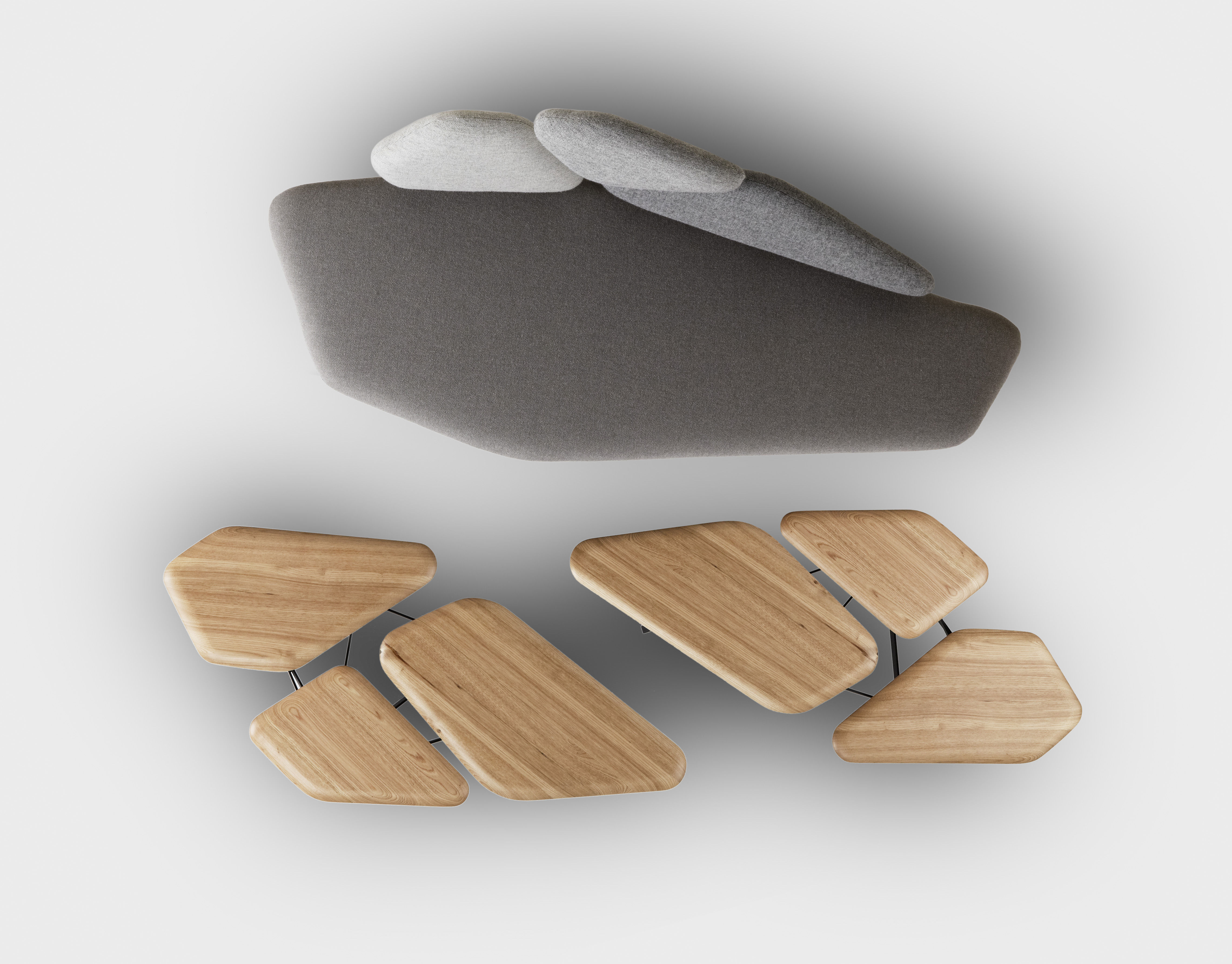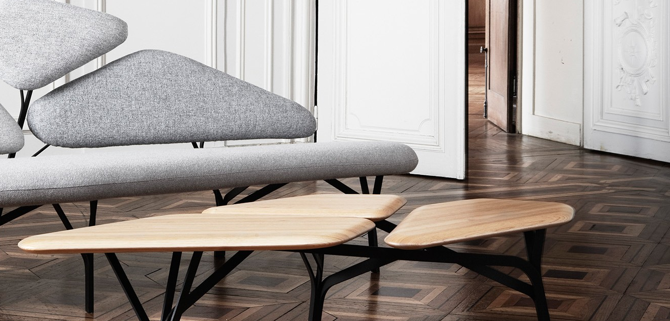 “波”是一个咖啡桌的灵感来自于石头松树波勒兹别墅的罗马。 金属结构繁殖的分支网络和支持三种木质表面。 表可以组合组合和成长这国内的树冠。
