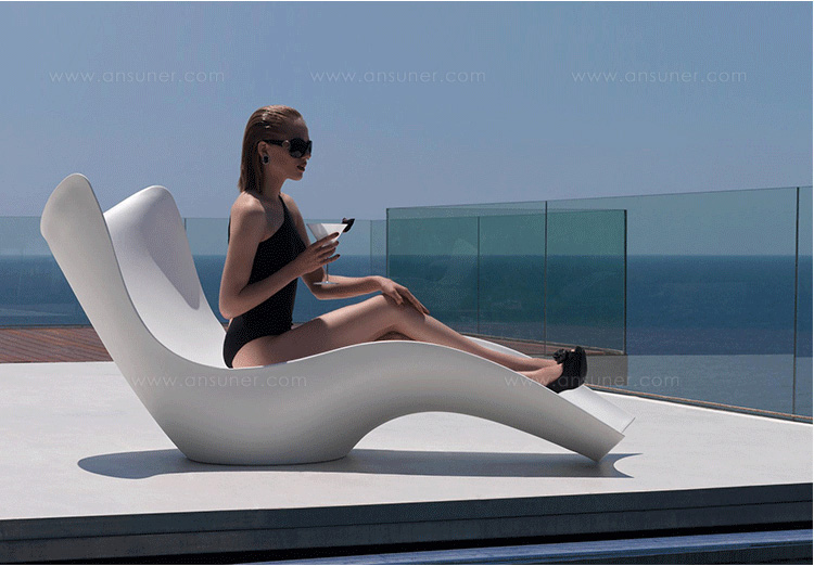 "波浪太阳椅由凯瑞德拉希德设计。它流动波浪型座位和支托,给人一种平静的感觉。运用这种柔软膨胀,流体姿态变化来改变活动的光线。设计者想要达到一种画布般的幸福感,并能唤起平静,漫不经心感觉,使人充满活力,令人耳目一新,宛若一个新的觉醒,升降全面推动力。"