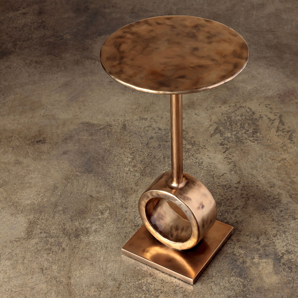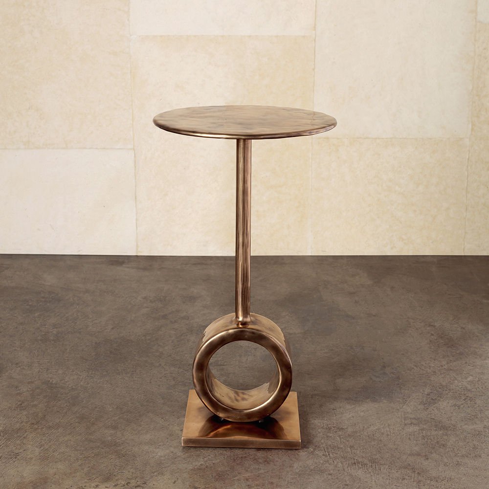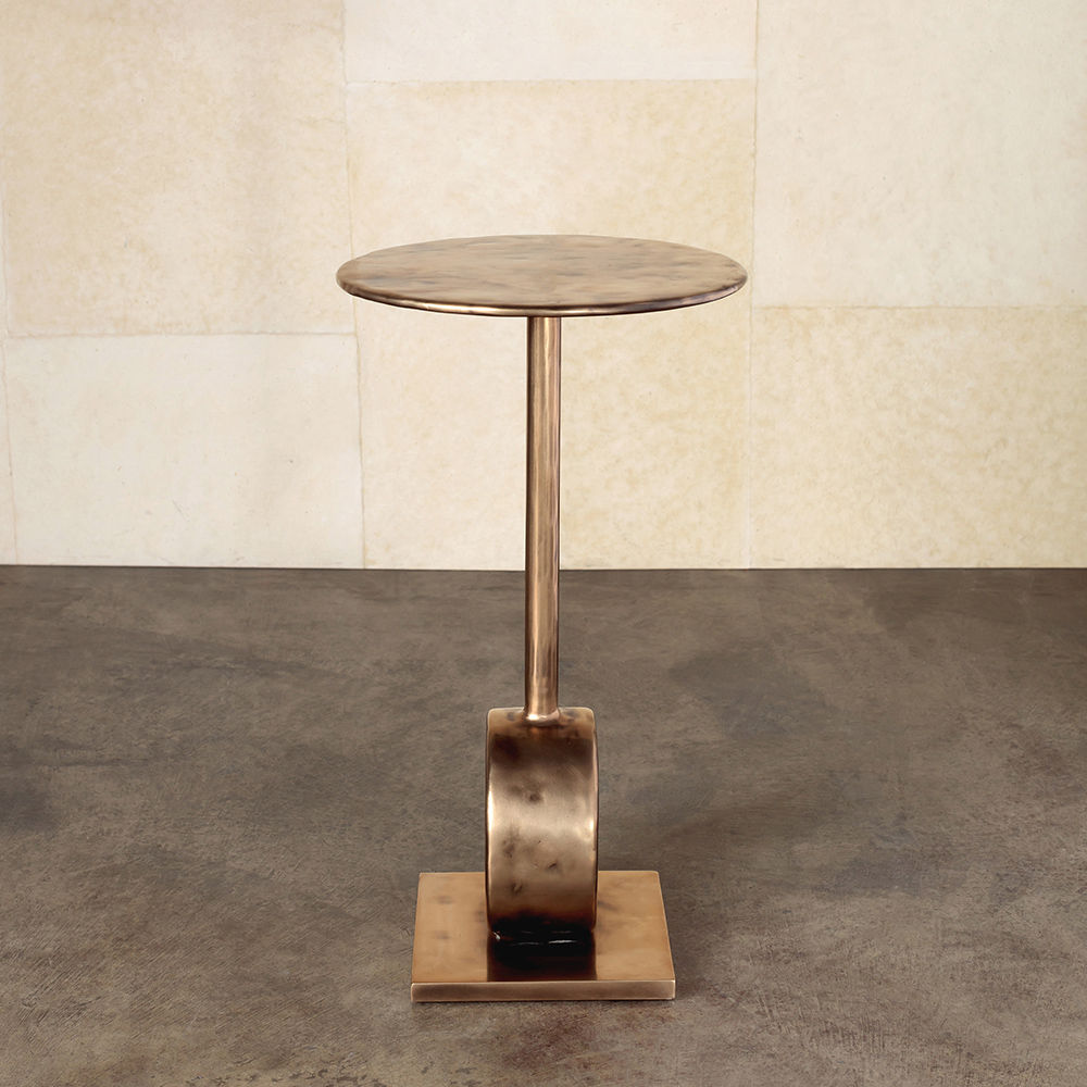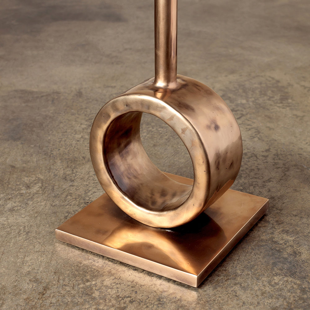 这款小巧的鸡尾酒桌巧妙地采用实心青铜铸造而成,具有斑驳的手工凿成的表面纹理。 圆柱形底座和精致的杆为这件作品赋予了雕塑般的品质。