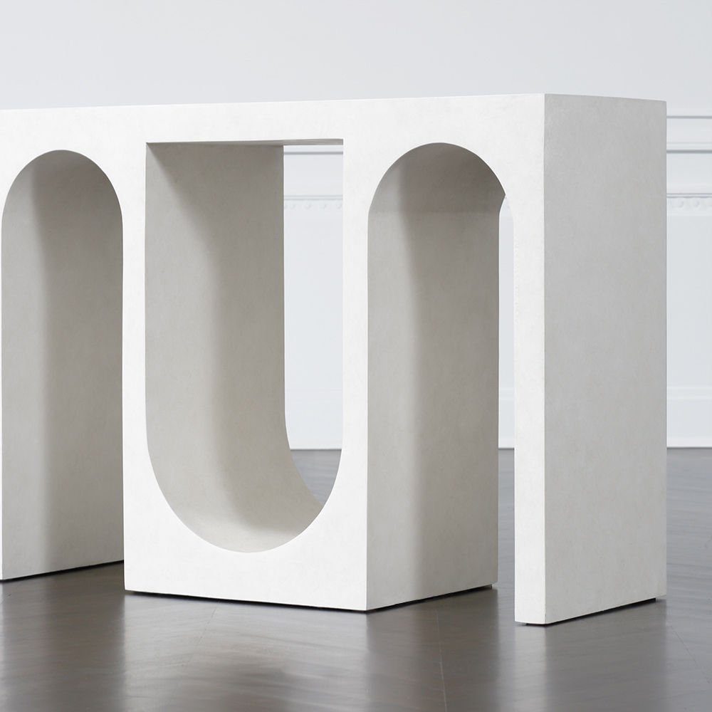 Roxbury玄关台采用实心树脂铸造,手工抹平石膏饰面,具有图形轮廓。 交替的拱形形成了这个独特的玄关台的形状,创造了空间几何和颜色的美丽调制。
