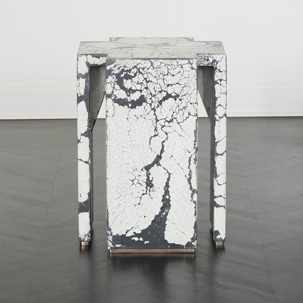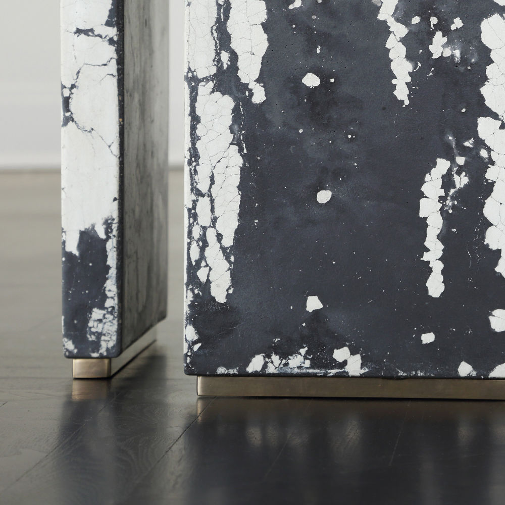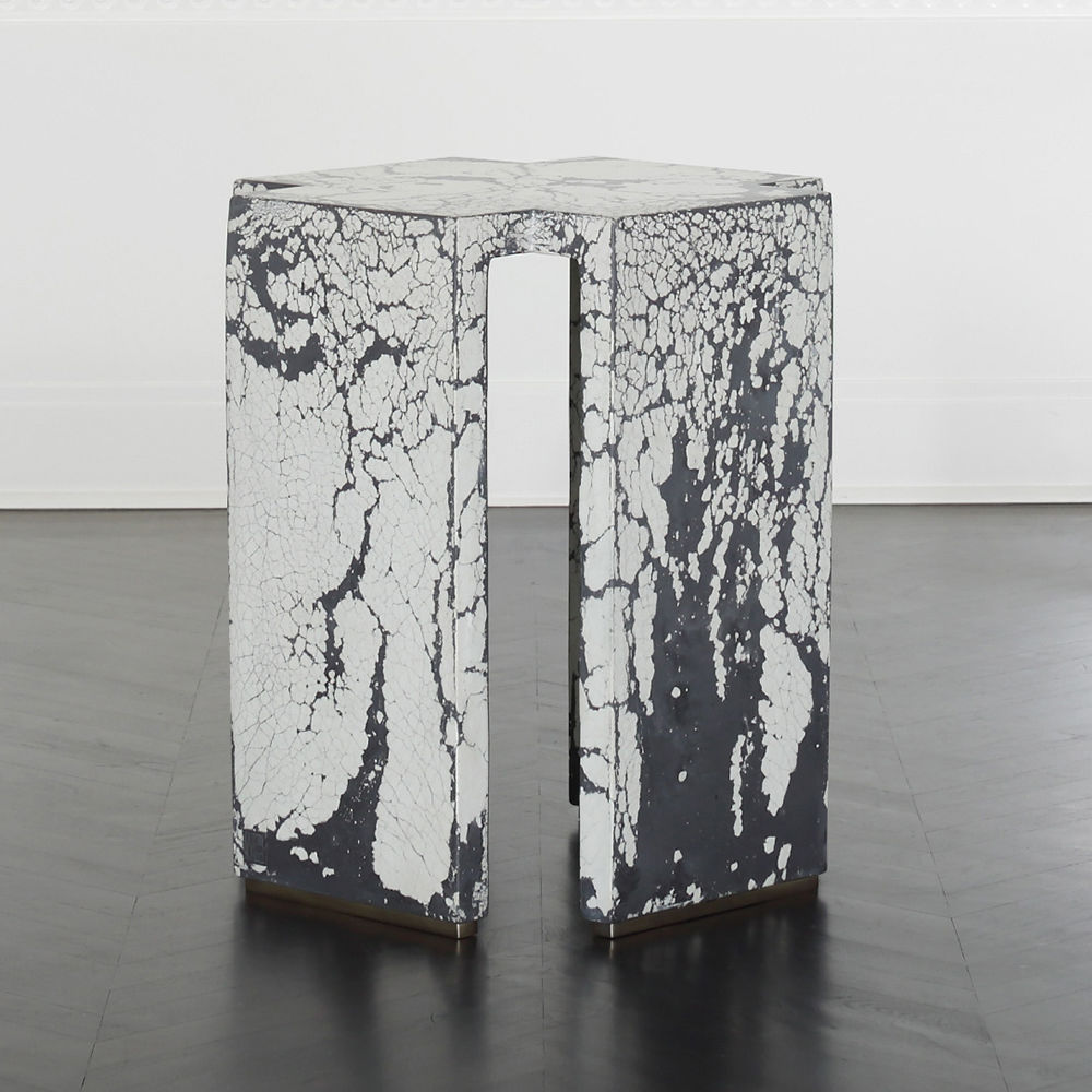 这个现代和建筑边几是手工浇筑的混凝土。 混凝土中充满了颜料,使每种形状都具有完全独特的色偏。 每个十字形腿都终止于坚固的抛光黄铜脚。 每张桌子的一面都印有Kelly Wearstler标志。