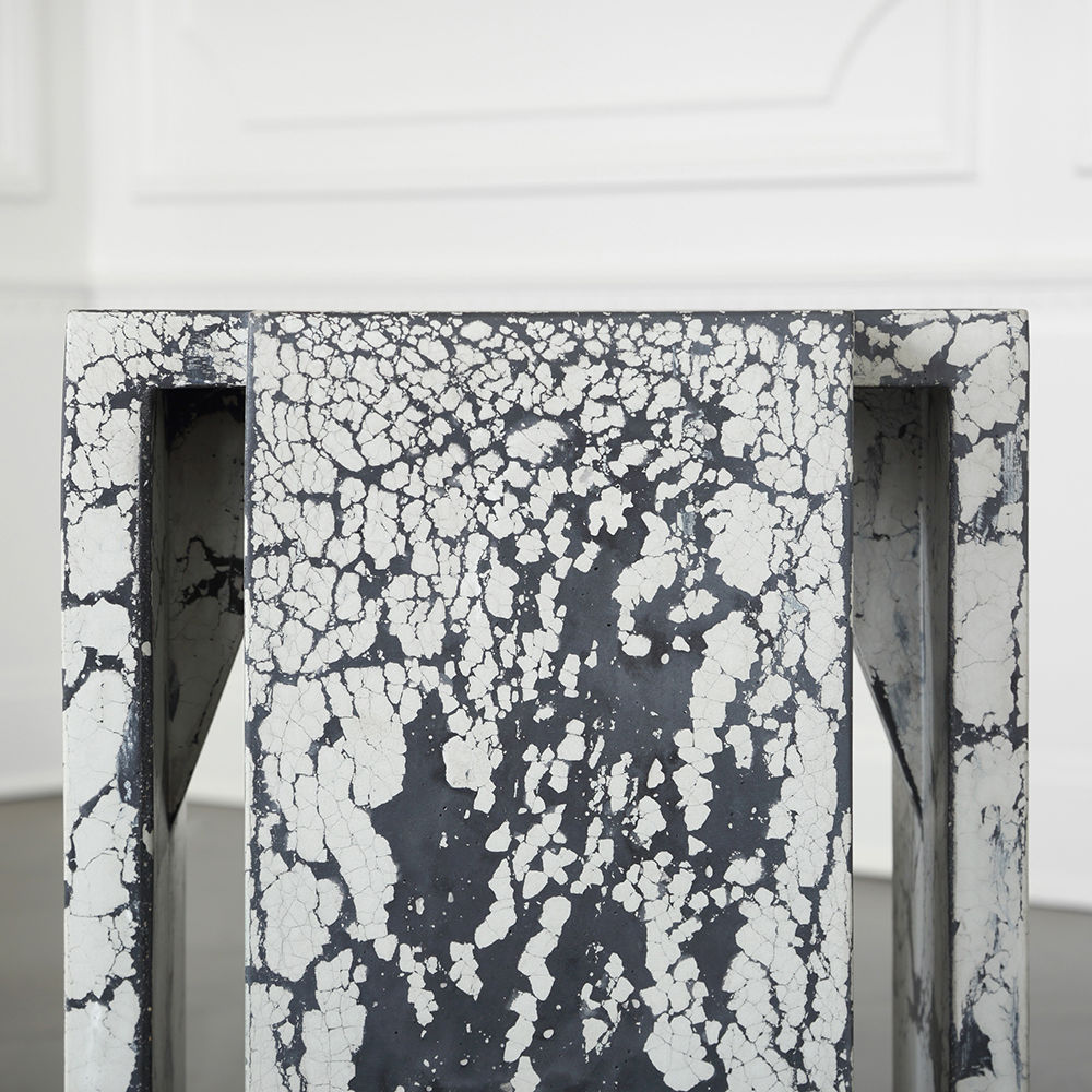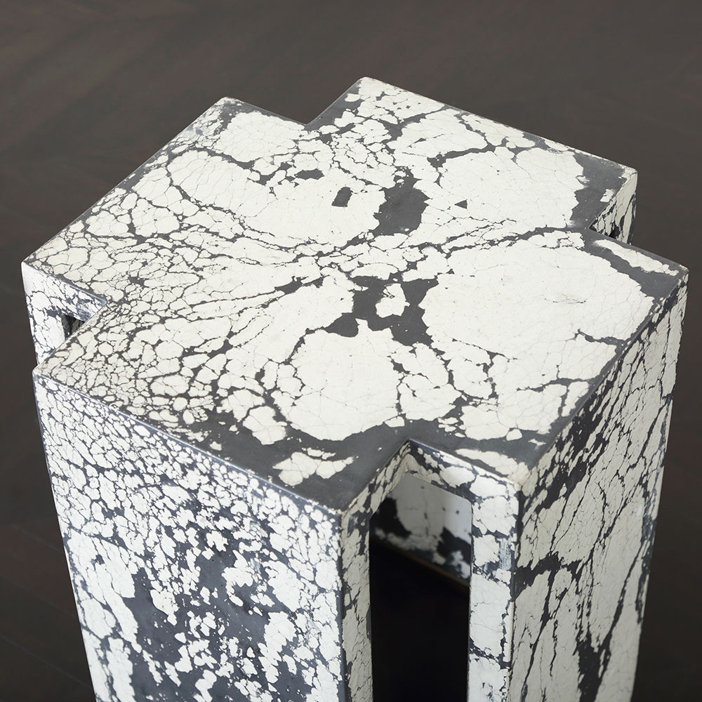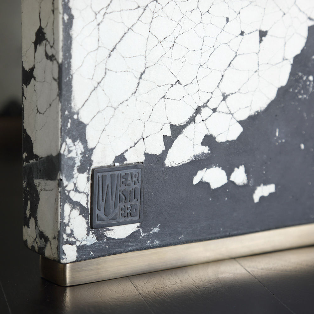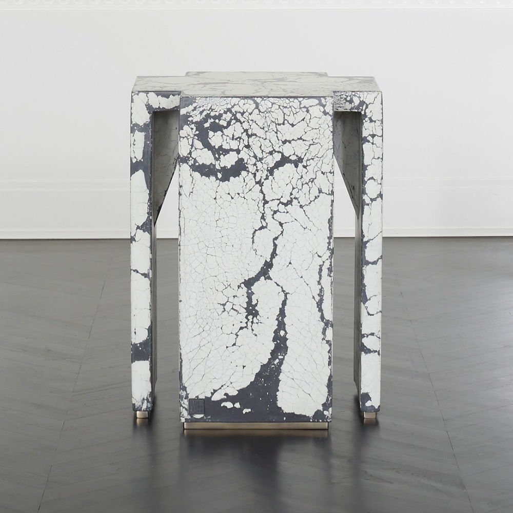 这个现代和建筑边几是手工浇筑的混凝土。 混凝土中充满了颜料,使每种形状都具有完全独特的色偏。 每个十字形腿都终止于坚固的抛光黄铜脚。 每张桌子的一面都印有Kelly Wearstler标志。