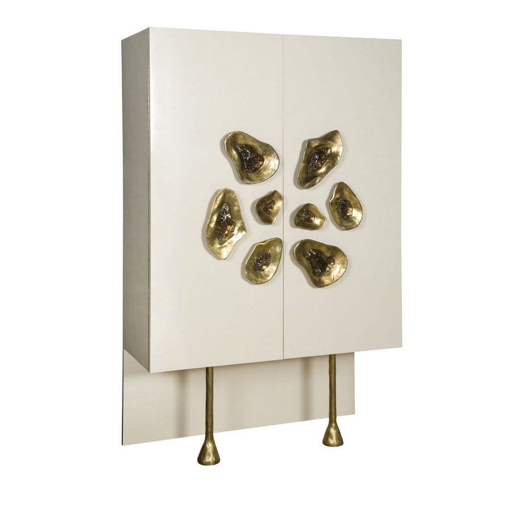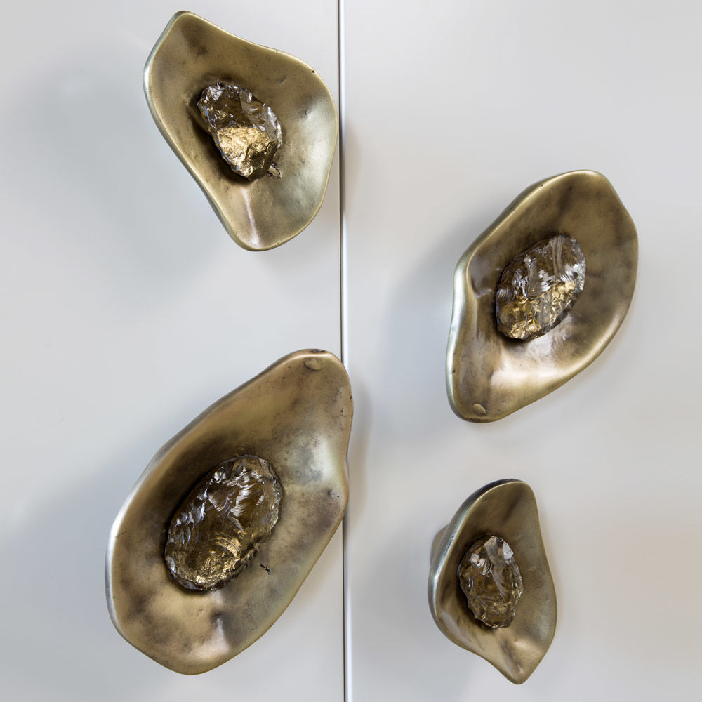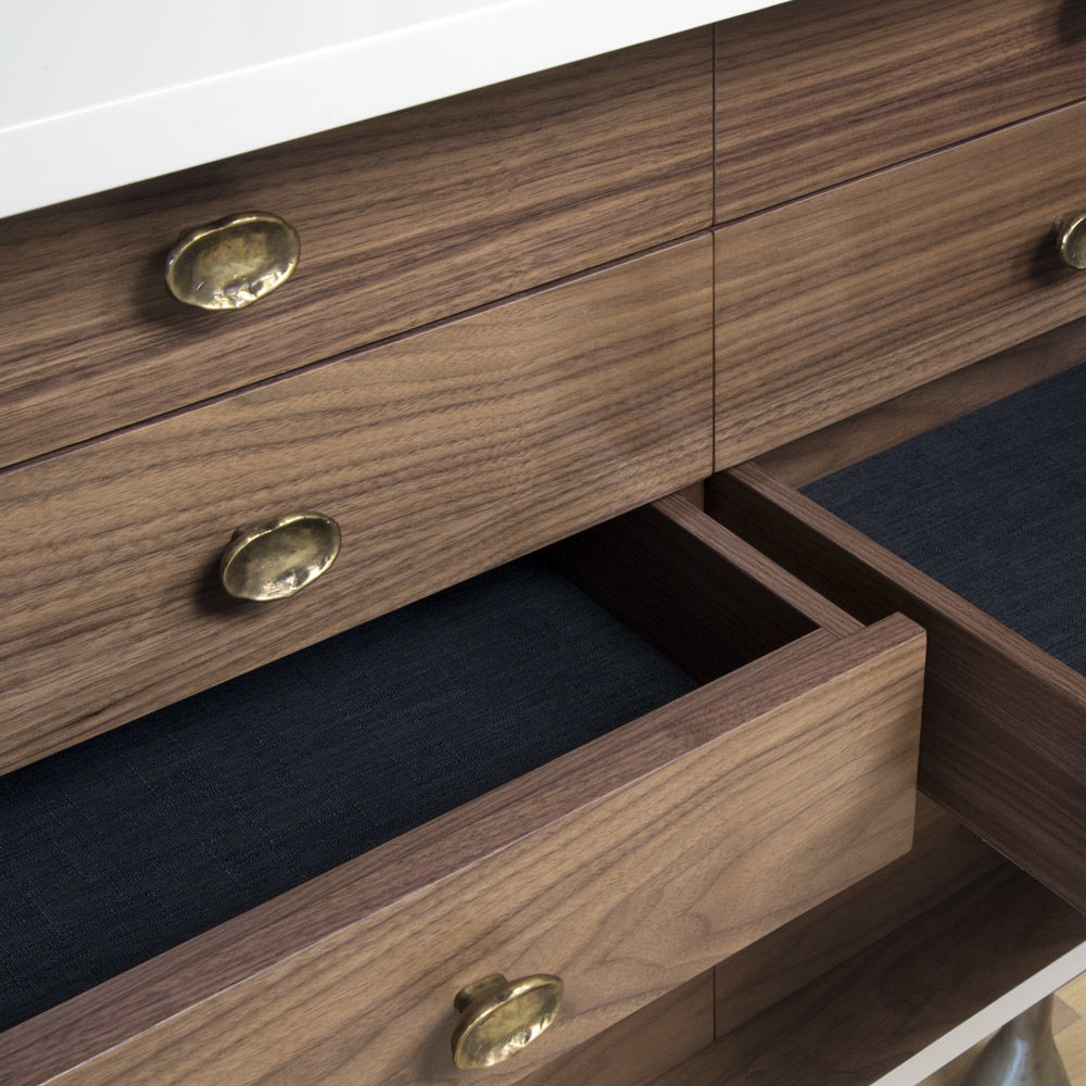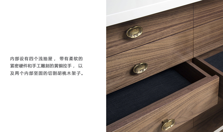 Crescent书橱的超大雕塑装饰为这款大型控制台带来丰富而不可否认的优雅气质。 坚固的美国胡桃木表壳,采用华丽的象牙色漆面漆制成,有铸造黄铜腿。 正面采用实心黄铜制成,带有手工切割的铸造玻璃中心。 内部设有四个浅抽屉,带有柔软的紧密硬件和手工雕刻的黄铜拉手,以及两个内部坚固的切割胡桃木架子。 天然胡桃木内饰,抛光黄铜抽屉拉,黄铜门拉和腿,碎玻璃。