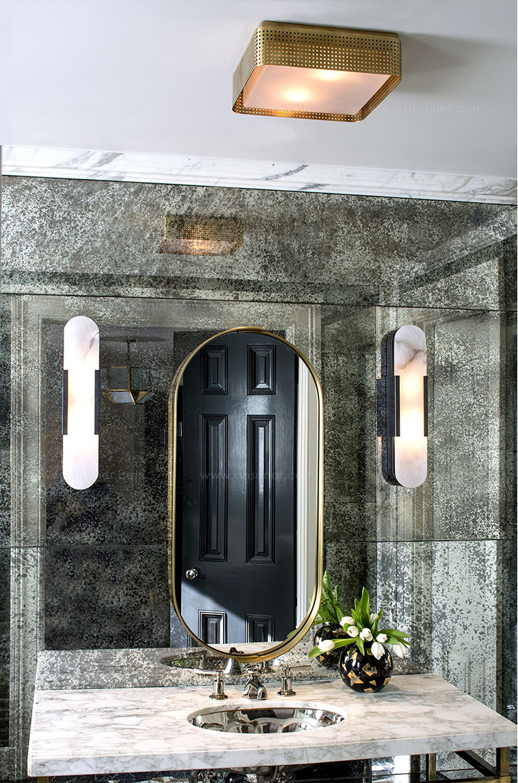 Melange壁灯采用流线型几何形状,轻松搭配天然雪花石膏和时尚金属细节,散发出现代气息,同时强调天然石材的美感。 这款壁灯采用手工雕刻的天然雪花石膏,配以古董黄铜,青铜或抛光镍细节,适合潮湿环境。