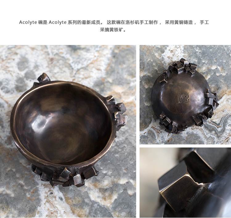 Acolyte碗是Acolyte系列的最新成员。 这款碗在洛杉矶手工制作,采用黄铜铸造,手工采摘黄铁矿。