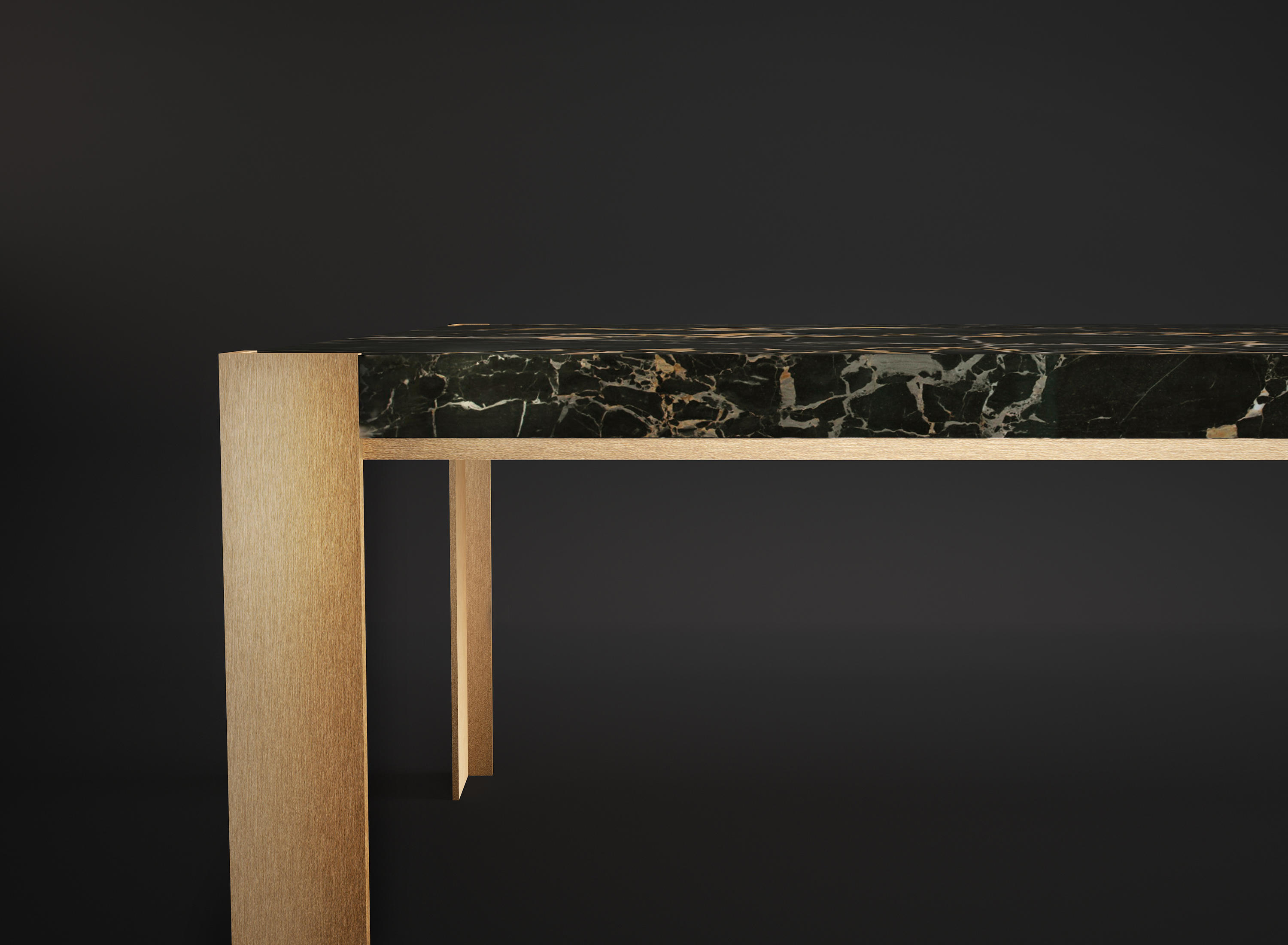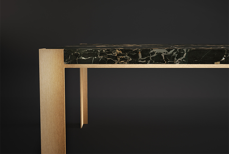 Stuart同时精致而简约,但最令人惊讶的是其结构的材质:它采用黑色大理石台面和拉丝黄铜框架。 大理石纹理的温暖阴影增强了它的清醒。