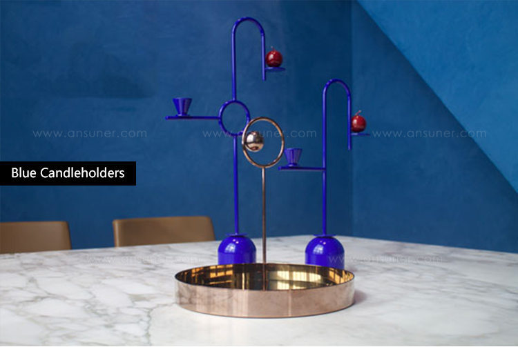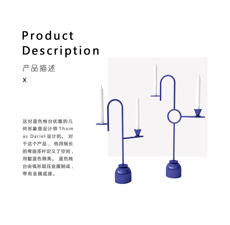 这对蓝色烛台优雅的几何形象是设计师Thomas Dariel设计的。 对于这个产品,他用细长的弯曲茎杆定义了空间,用靛蓝色照亮。蓝色烛台由弧形层压金属制成,带有金属底座。