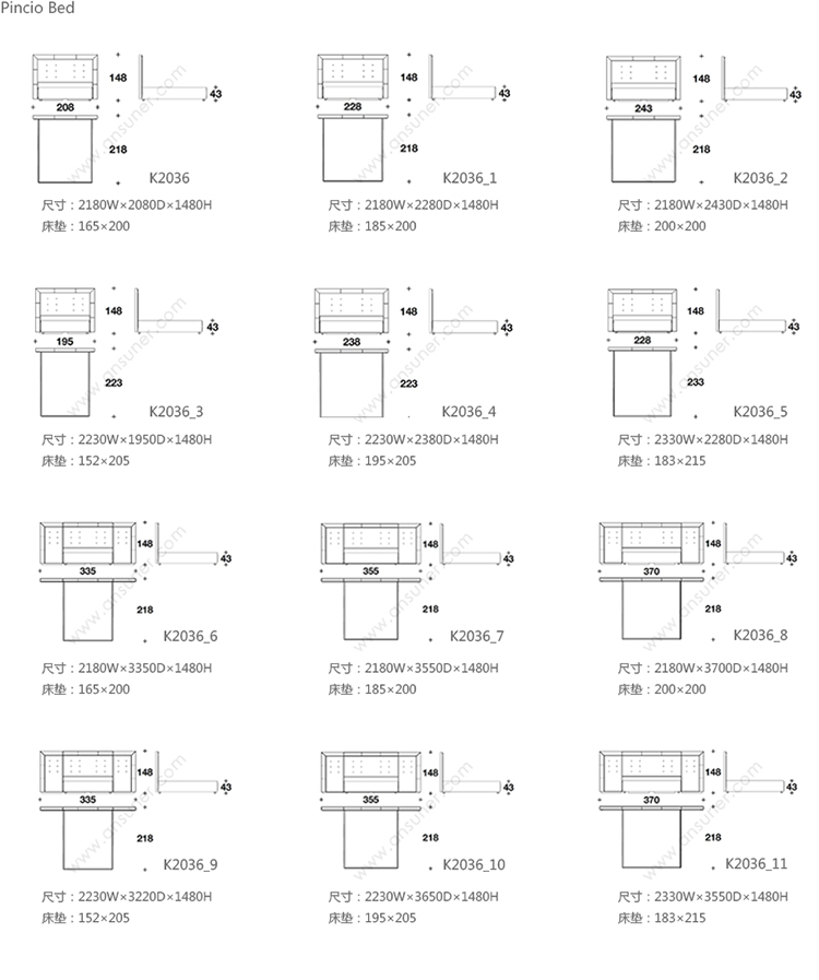 Pincio Bed 系列尺寸/示意图