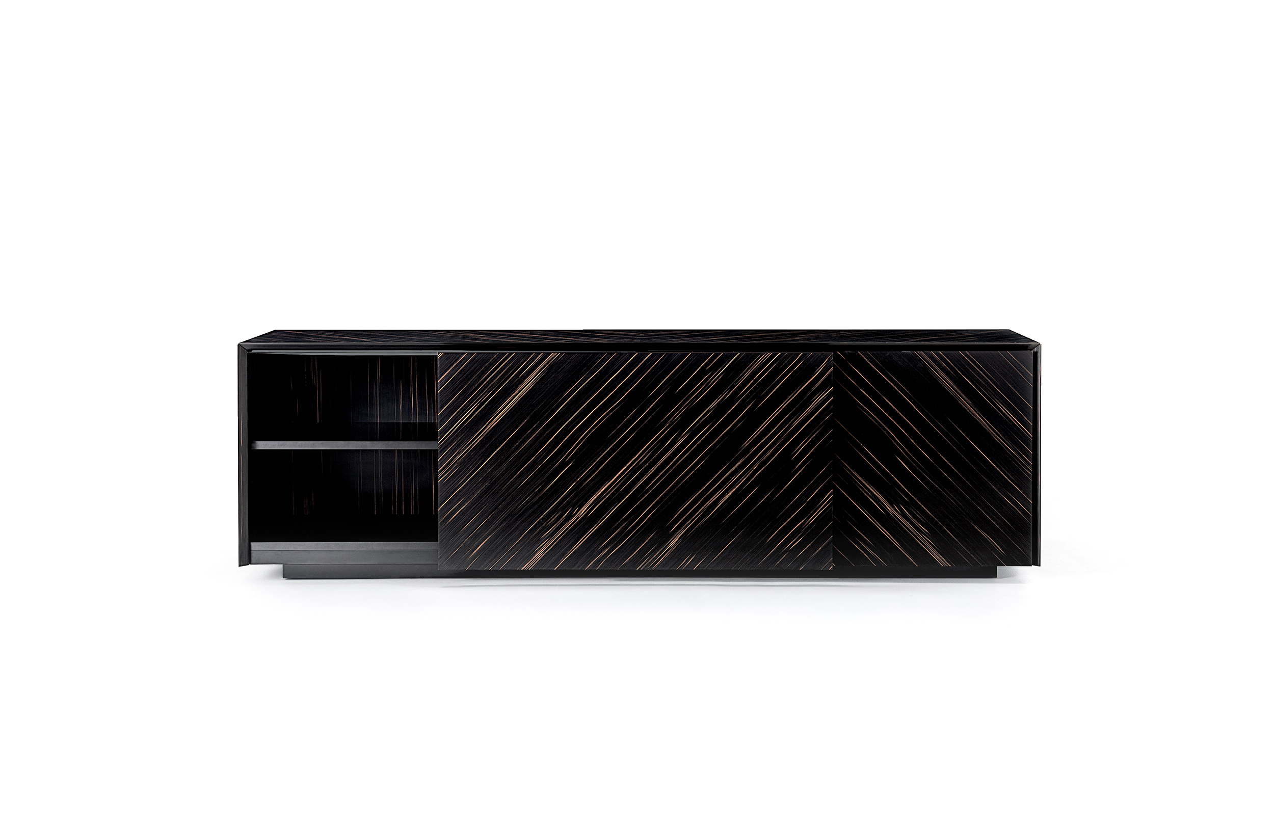 SHUTTERS Coplanar opening system, wood covered in Vermont leather or veneered Ebony Macassar with matt finishing