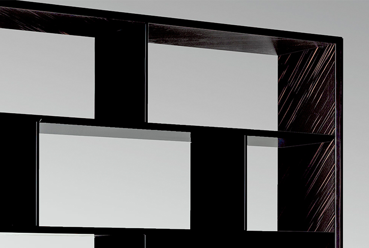 SHELVES AND DIVIDERS Glossy brushed lacquered wood coordinated with the leather. Ebony Macassar version with matt lacquered black wood or glossy brushed lacquered black wood