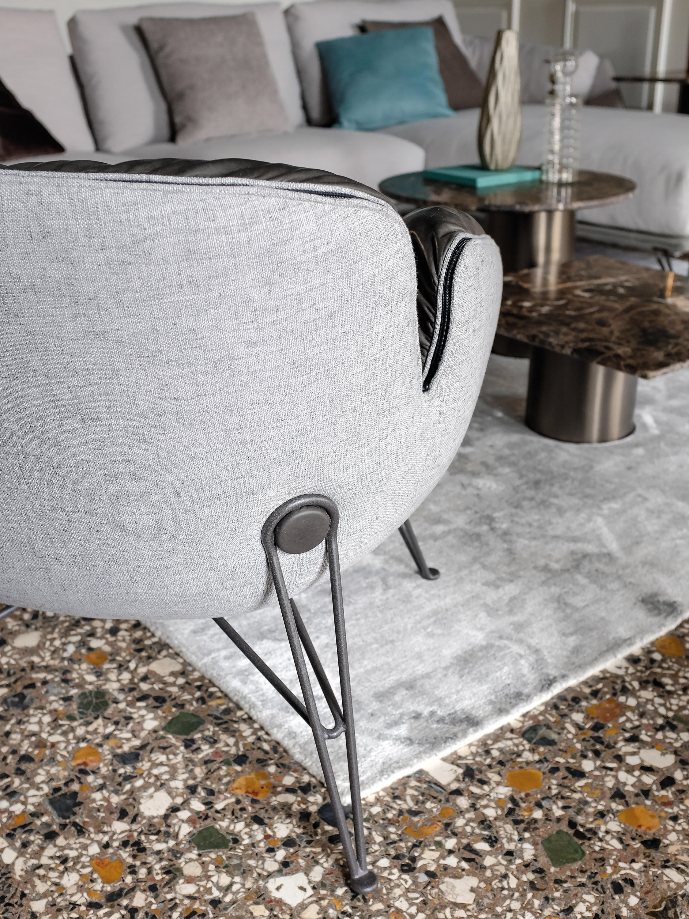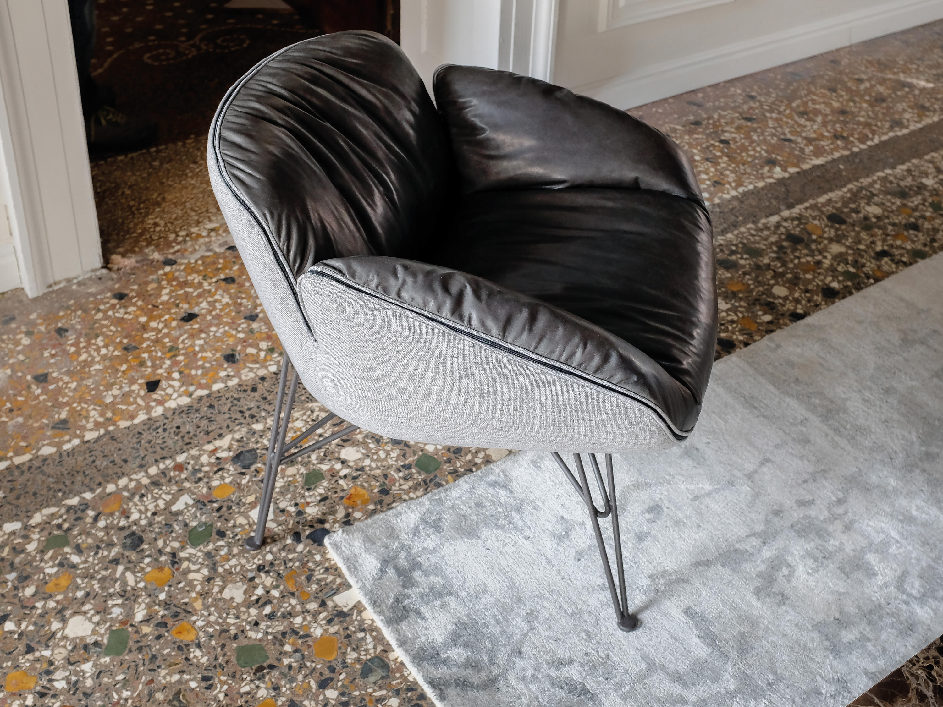 在扶手椅朱诺的背部和手臂柔软的衬垫与薄结构的严谨性形成鲜明对比。一条细长的线连接着内部和外部的部分。拉链在扶手周边区域运行,在各个部分之间创建了一个令人着迷的连接。框架由四个金属脚组成,它们构成了光的三维形态。