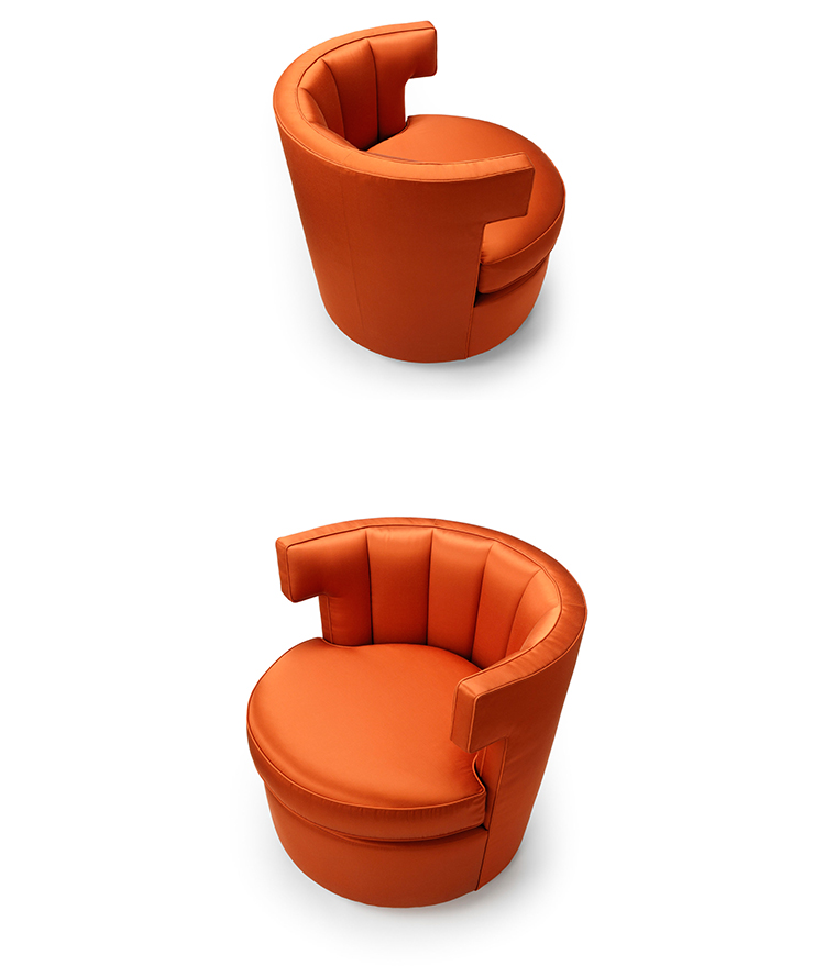 Sazerac 沙发椅简便又放心,在酒吧、休息室或卧室里都很舒适。这里展示的是软垫缎纹织物。椅子底座可用金属或织物覆盖