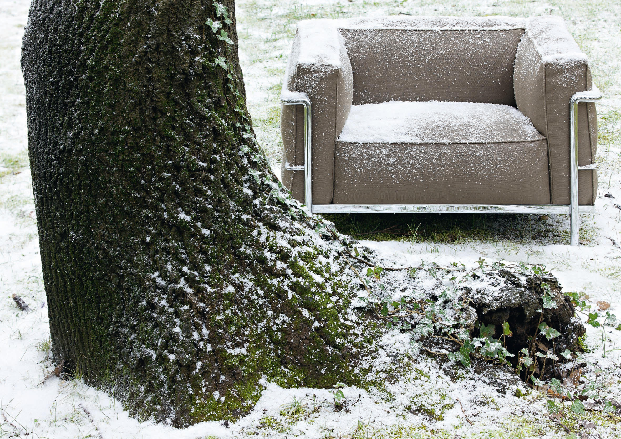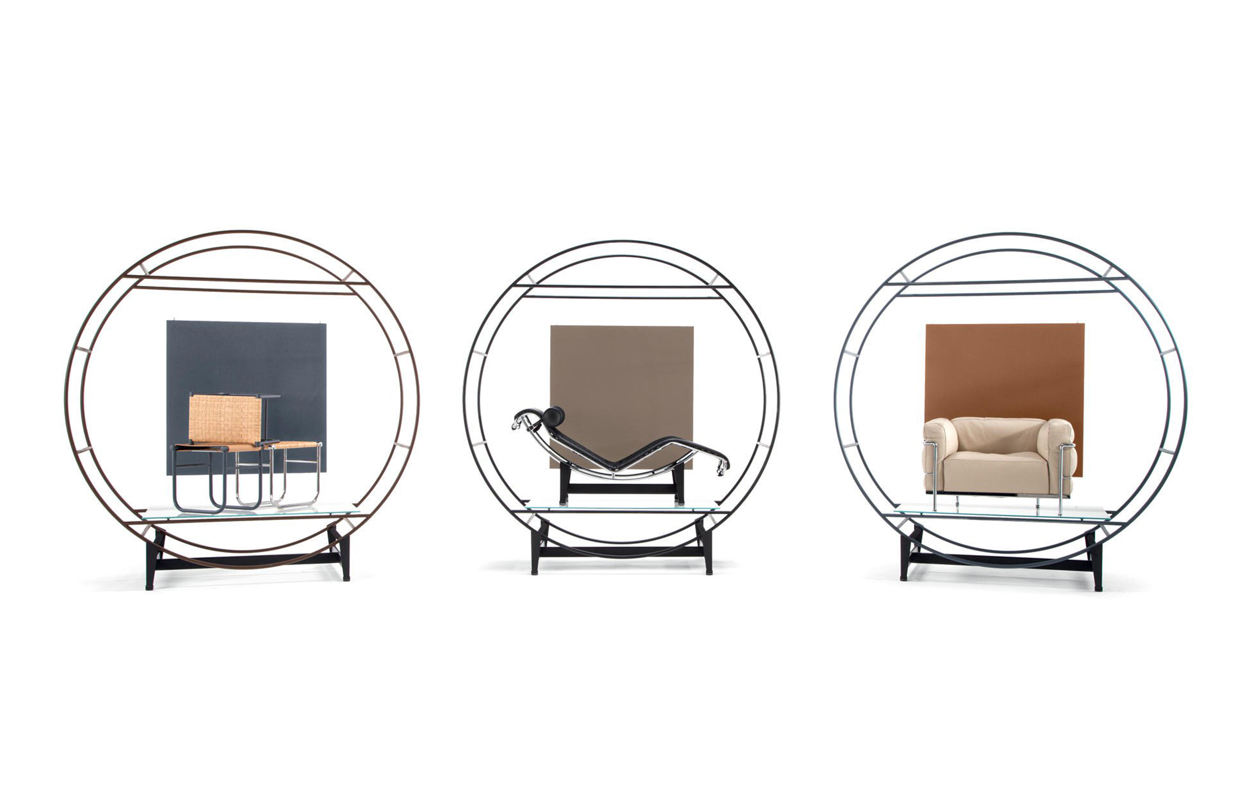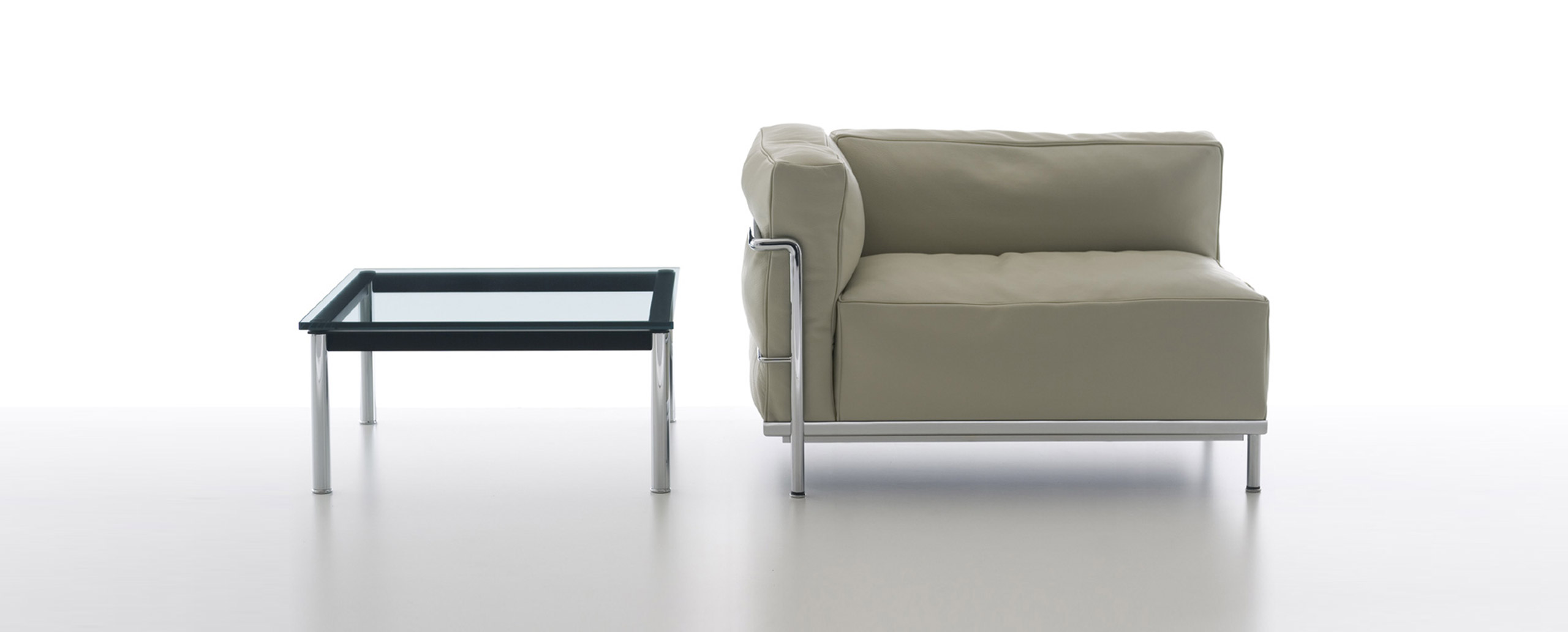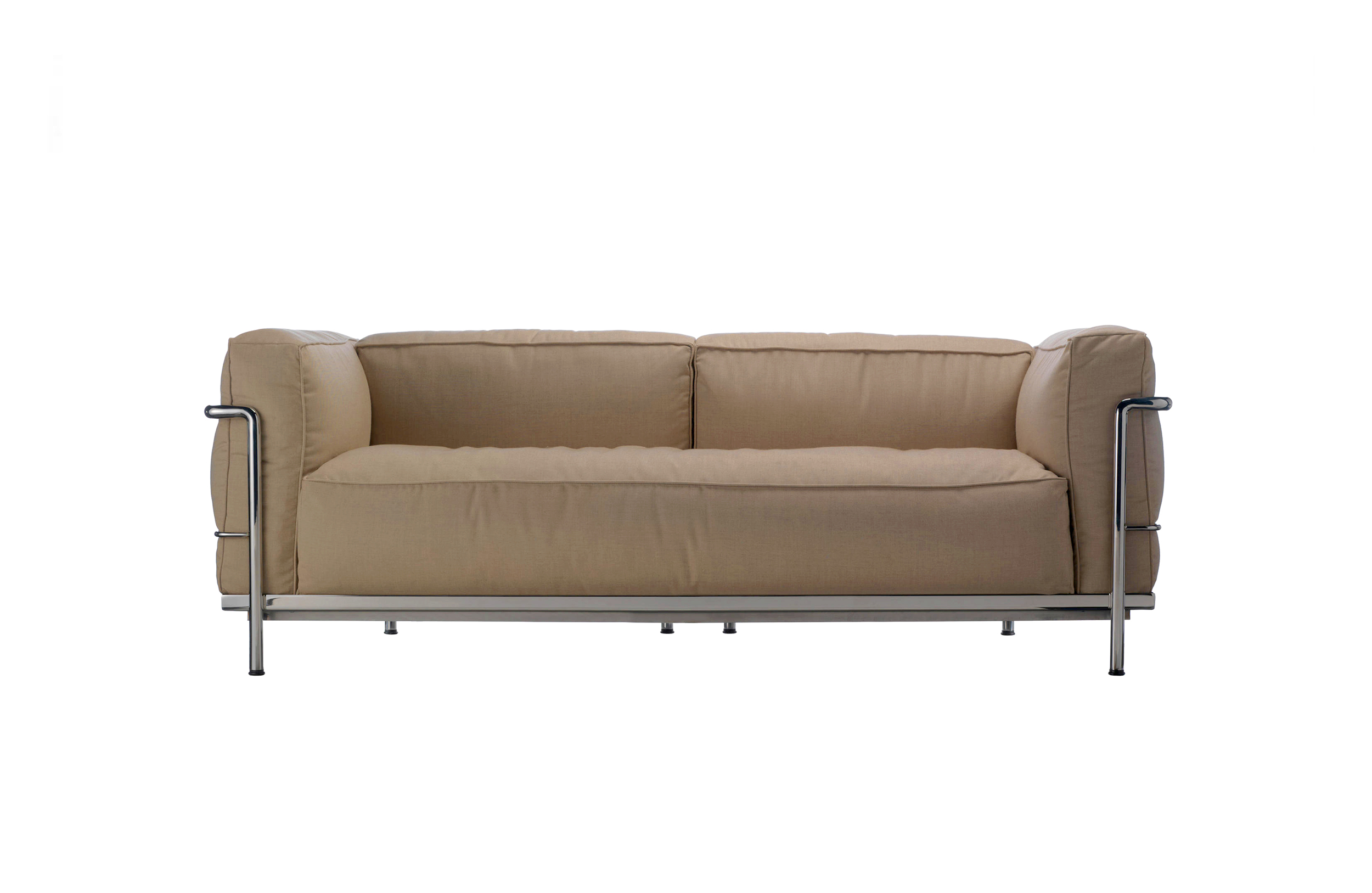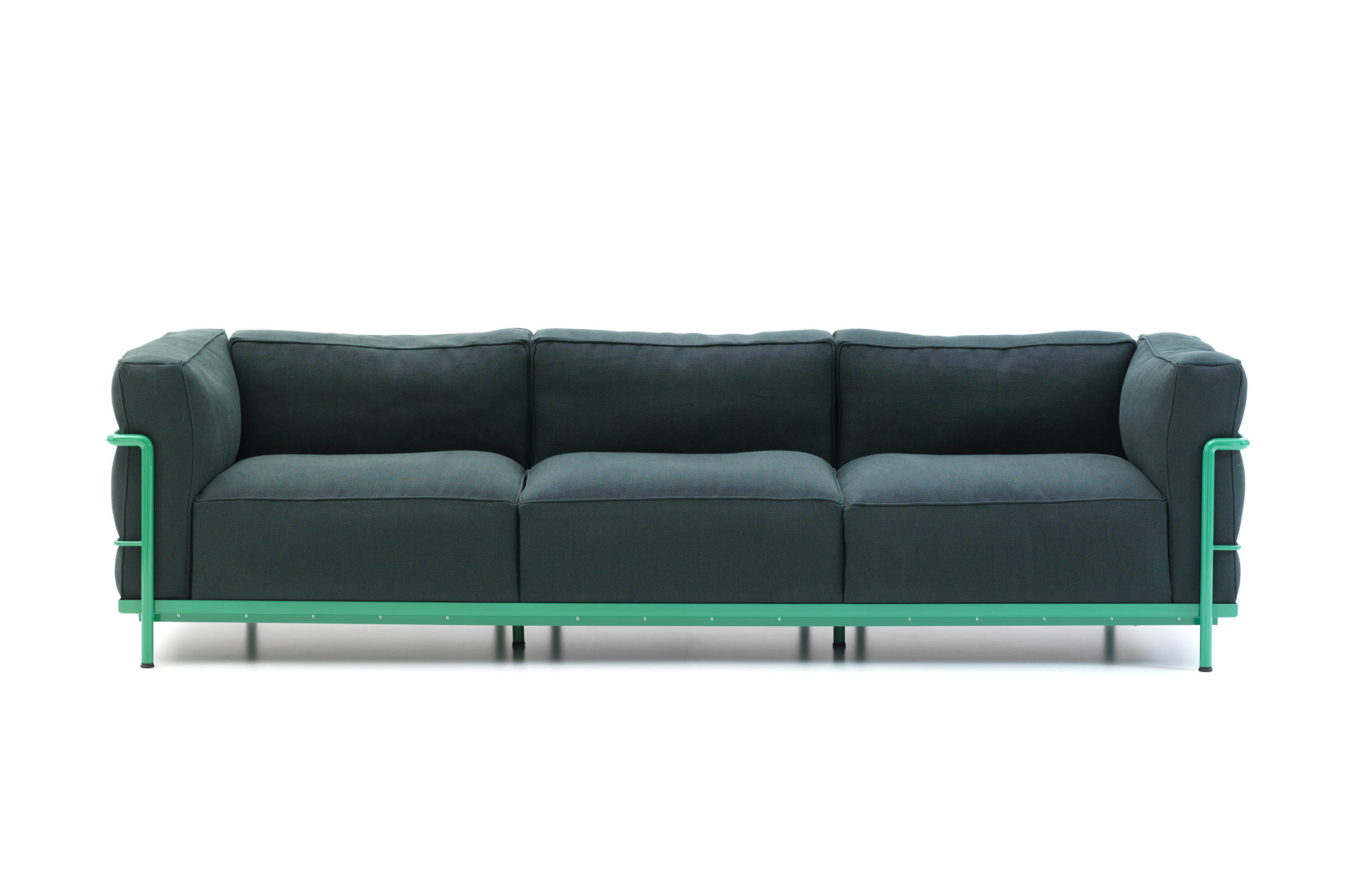 Fauteuil Grand Confort, 又称LC3。采用CR3三价镀铬钢材质或光泽玄武岩搭配灰色、亮蓝、绿色、枣红及赭色或哑光黑色珐琅钢架的双扶手椅和左/右单扶手椅及两人位/三人位沙发。柔软的衬垫采用聚氨酯海绵和喷胶棉或聚氨酯芯羽绒棉。皮革或布艺面料软包;镀铬框架结构可由布艺软包。同样有户外版本。