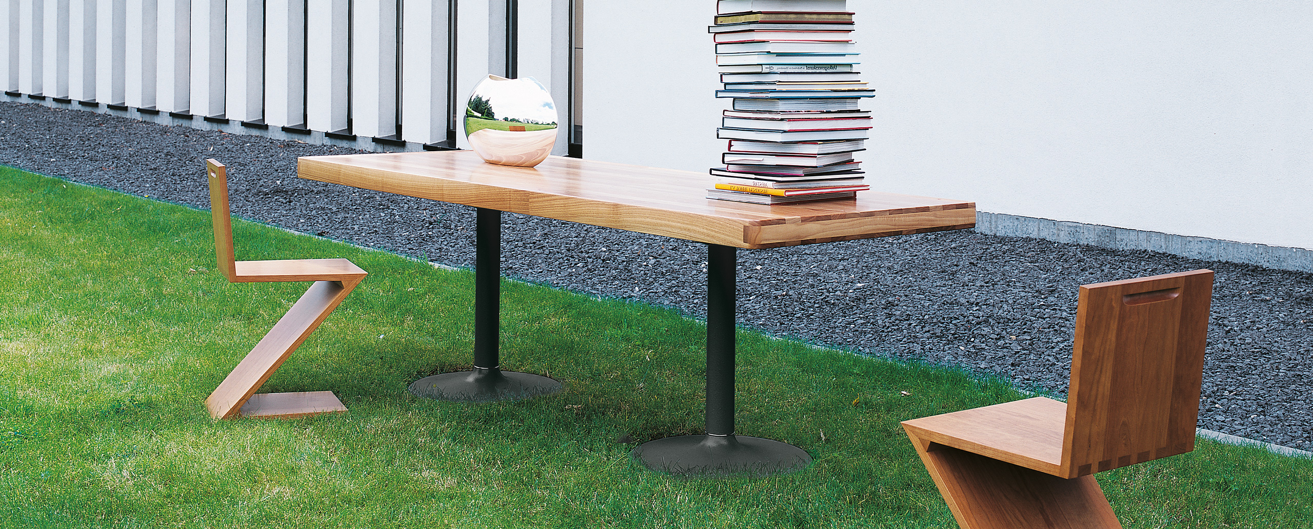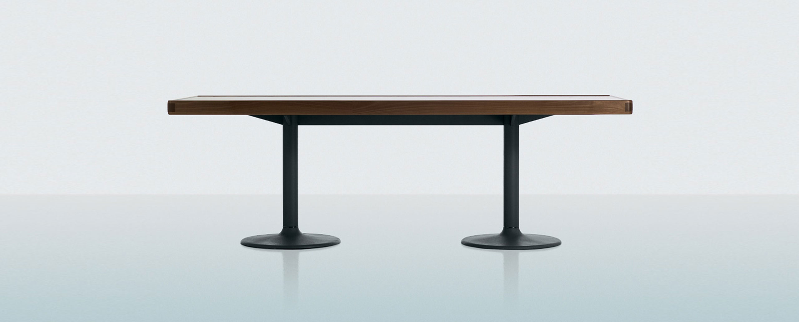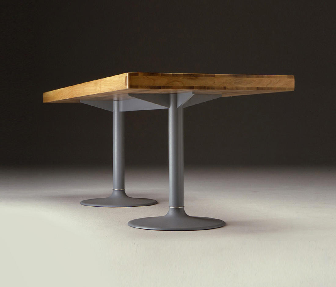 1984年的Charlotte Perriand设计的LC11复版。花冠脚桌。灰色搪瓷钢架机构和铸铁基底。一种采用哑光清漆胡桃木桌面(长220 cm - 86.6"),另一种采用卡拉拉大理岩桌面和灰色铸铁桌腿(长213,5 cm - 84")。包括二种基本型式的餐桌,第一种于1934年为Le Corbusier的Rue de Nungesser et Coli区巴黎公寓创作,第二种于1935年份为布鲁塞尔Maison du Jeune Home设计。
