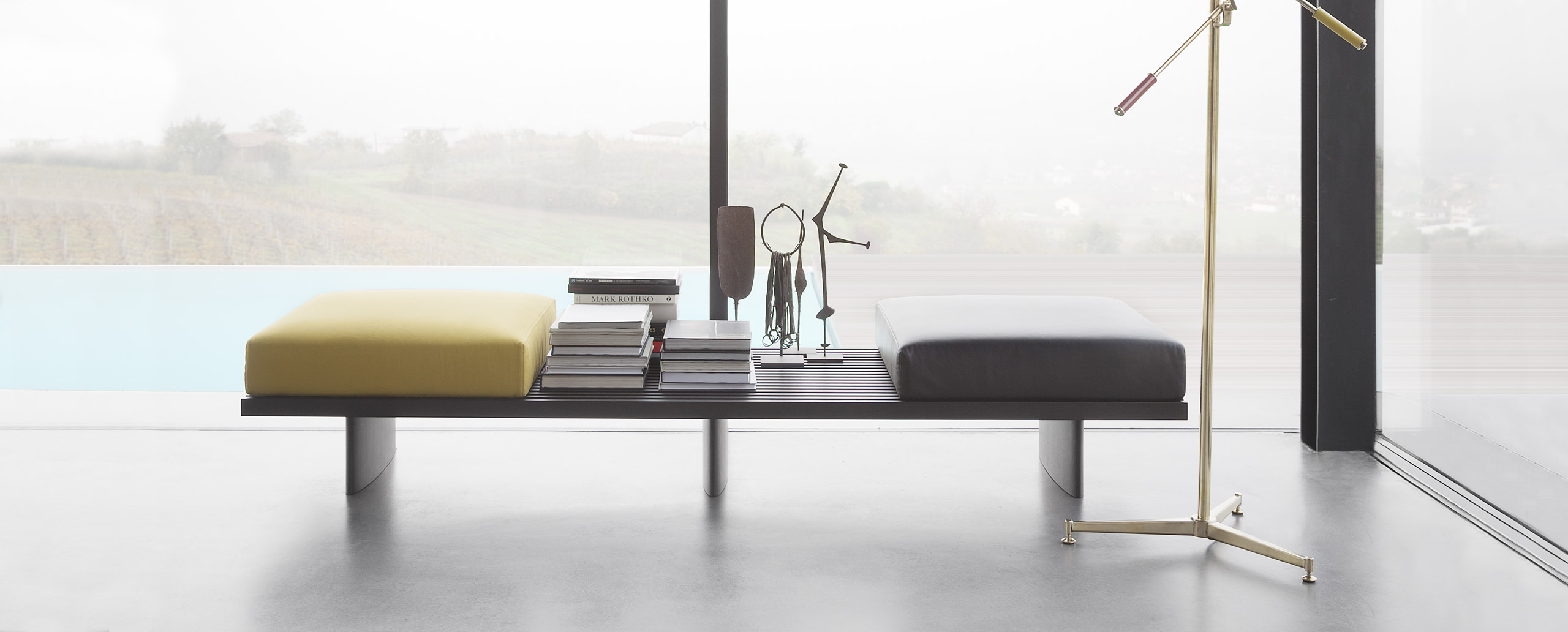 用作矮桌、长凳或和只需配备靠垫就能成为软榻的模块化系列。框架采用天然木色或黑色橡木。表面由19根板条组成;采用两条或三条支腿。软垫采用聚氨酯纤维和喷胶棉填充,用于扶手、座面,配对软垫: 一个座垫和一个靠垫。使用简单的固定装置就可将软垫固定于框架上。软垫可自由定位于表面的任何部分;因此,可使表面按照所需的尺寸用作座椅底座或顶面。