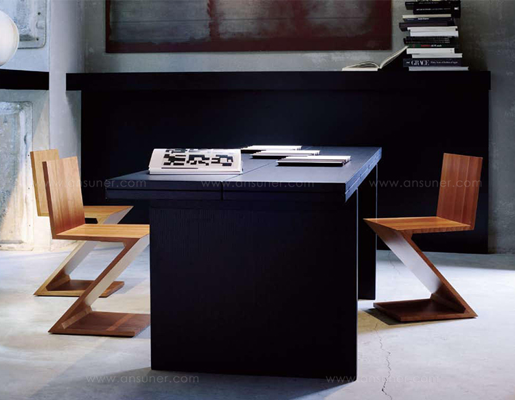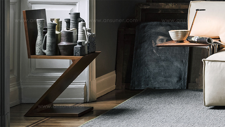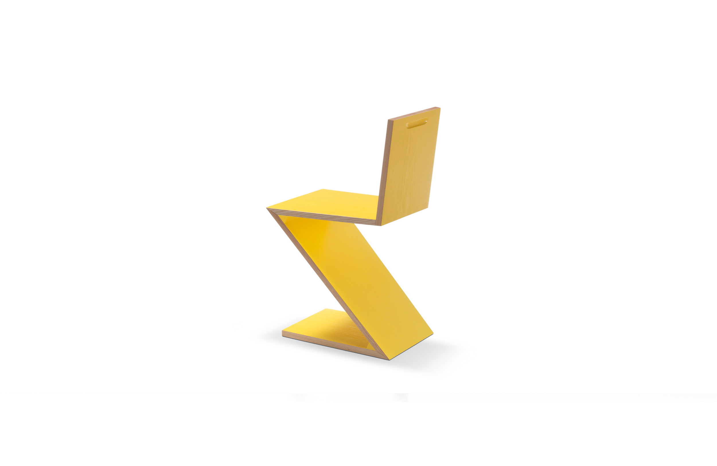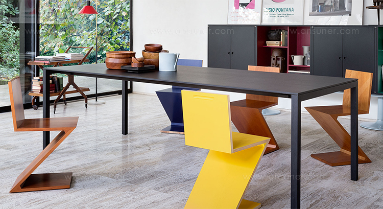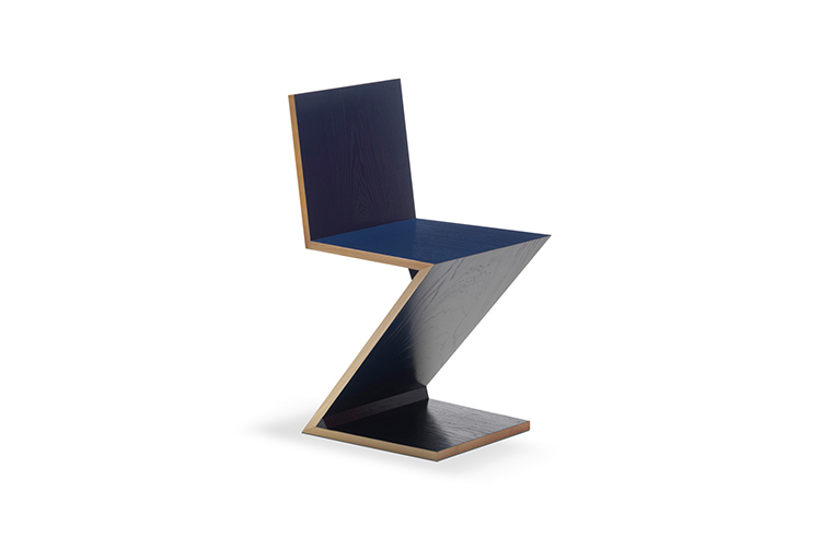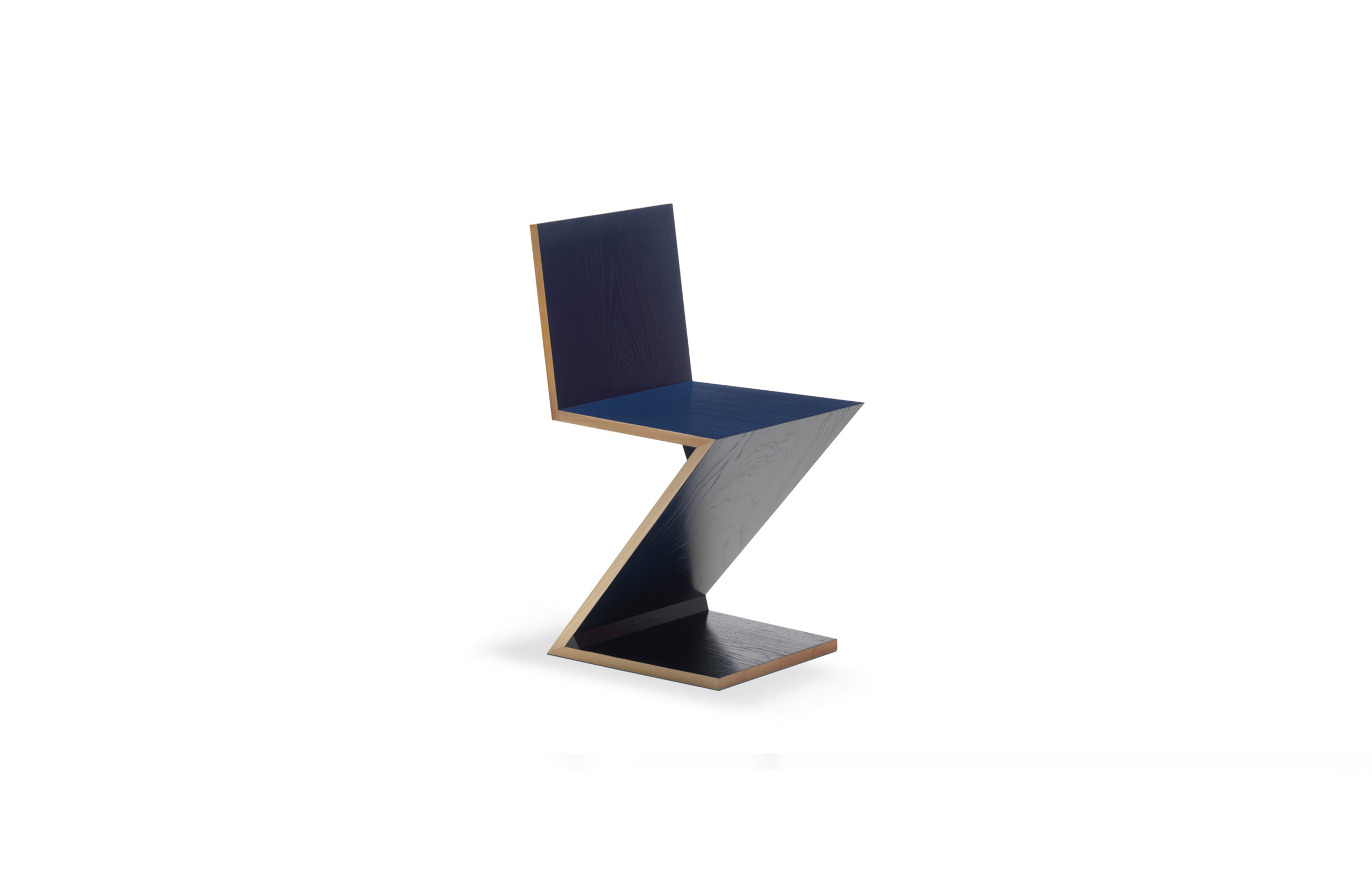 该款椅子采用天然樱桃木、天然白蜡木、或蓝色、红色、黄色、白色或黑色饰面的白蜡木制造,配有天然白蜡木边缘。靠背+座面+椅腿+椅脚。Rietveld 首次在利用新形状的场景中引入新类型椅子,归功于对角线的使用。锯齿状椅子拥有四个从顶部到底部依次优雅地弯曲的板,初看起来可能是不稳定的,但实际上非常四平八稳。