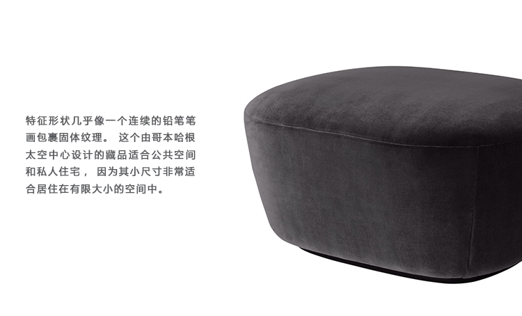 留下来,和我在一起,放松,留下来读书……Stay系列,包括两张躺椅,三张沙发和一张奥斯曼沙发,它具有雕塑的和有机的形状,除了给人一种现代的外观,还拥抱着用户,鼓励人们保持坐着。特征形状几乎像一个连续的铅笔笔画包裹固体纹理。这个由哥本哈根太空中心设计的藏品适合公共空间和私人住宅,因为其小尺寸非常适合居住在有限大小的空间中,保持舒适和舒适是必不可少的。