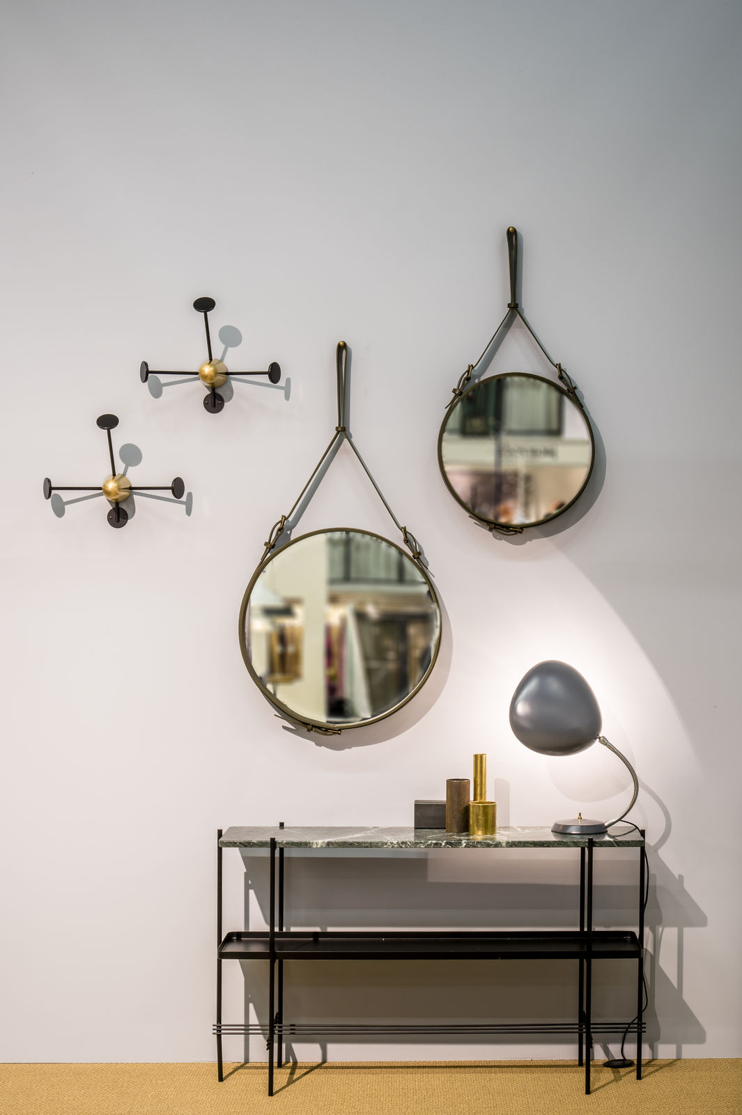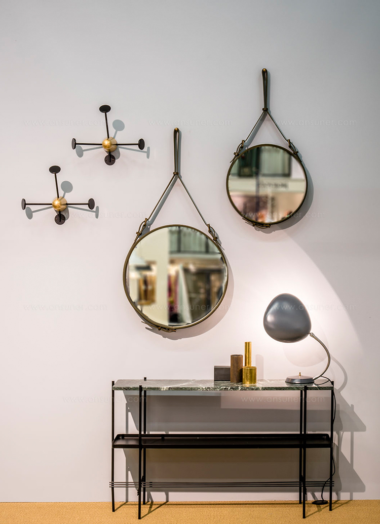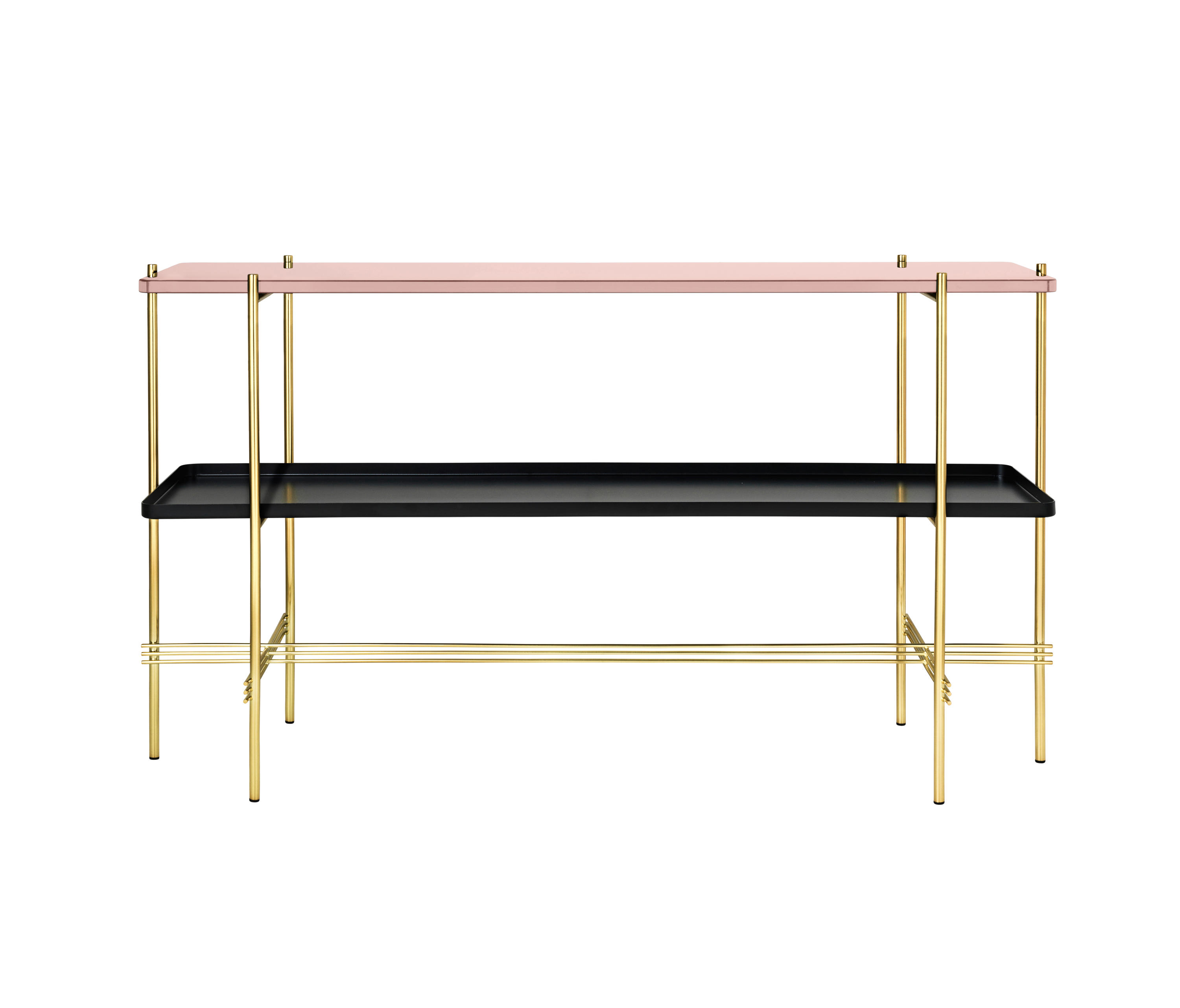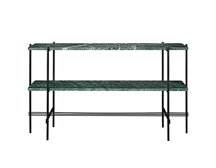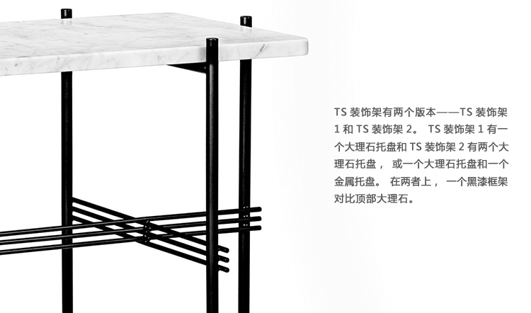TS装饰架有两个版本——TS装饰架1和TS装饰架2。TS装饰架1有一个大理石托盘和TS装饰架2有两个大理石托盘,或一个大理石托盘和一个金属托盘。在两者上,一个黑漆框架是对比大理石顶部。