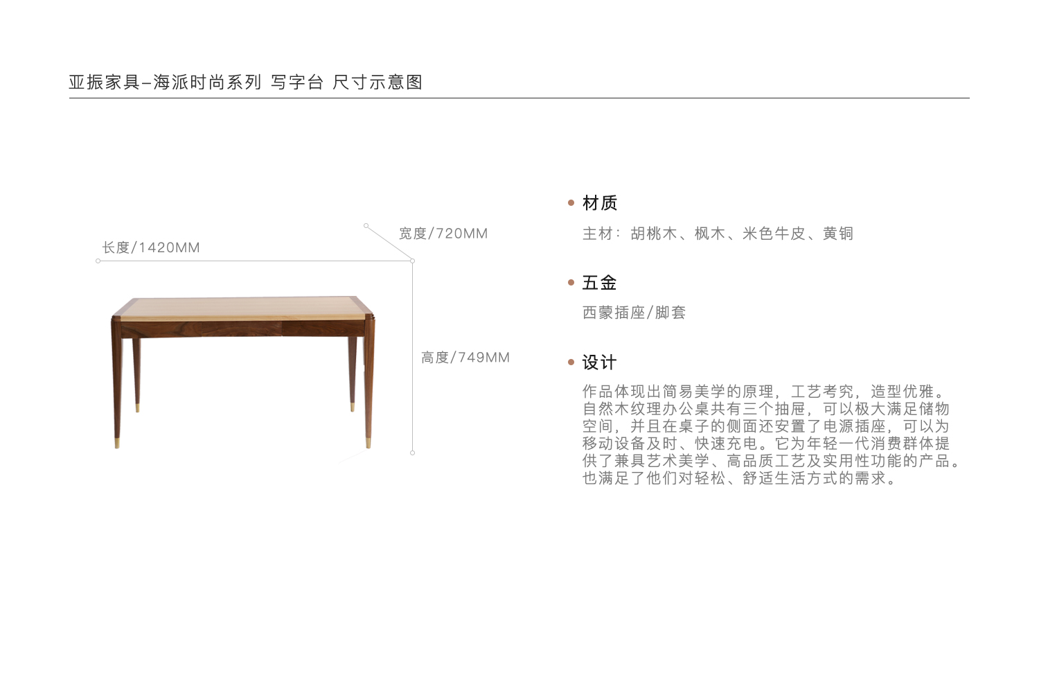 作品体现出简易美学的原理,工艺考究,造型优雅。自然木纹理办公桌共有三个抽屉,可以极大满足储物空间,并且在桌子的侧面还安置了电源插座,可以为移动设备及时、快速充电。它为年轻一代消费群体提供了兼具艺术美学、高品质工艺及实用性功能的产品。也满足了他们对轻松、舒适生活方式的需求。