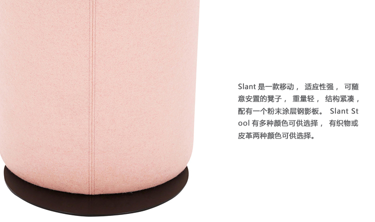 Slant是一款移动,适应性强,可随意安置的凳子,重量轻,结构紧凑,配有一个粉末涂层钢影板。Slant Stool有多种颜色可供选择,有织物或皮革两种颜色可供选择。