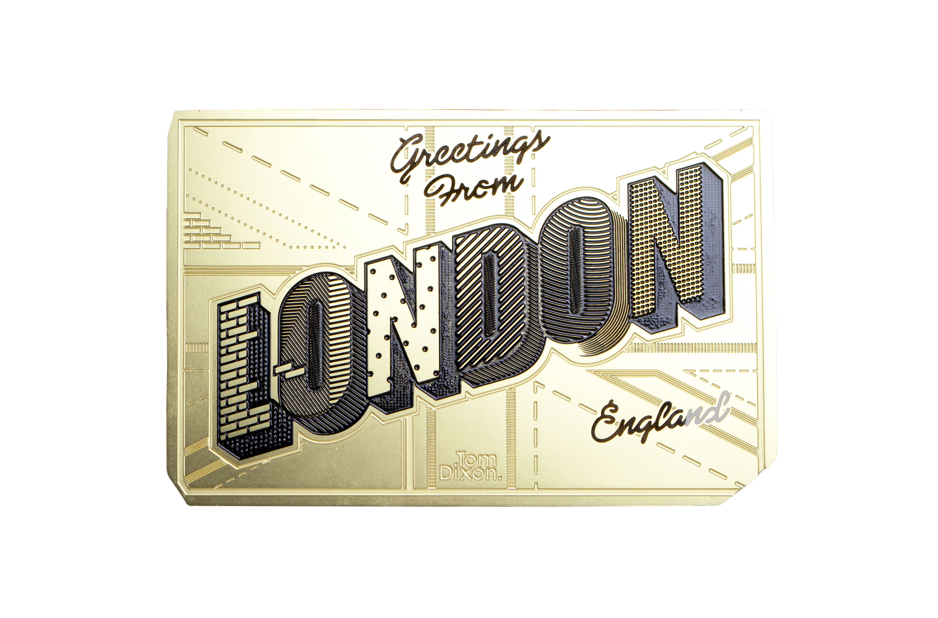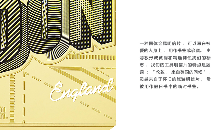 一种固体金属明信片,可以写在被爱的人身上,用作书签或珍藏。由薄板形成黄铜和精确刻蚀我们的标志,我们的工具明信片的特点是题词:“伦敦,来自英国的问候”,灵感来自于怀旧的旅游明信片,常被用作假日书中的临时书签。