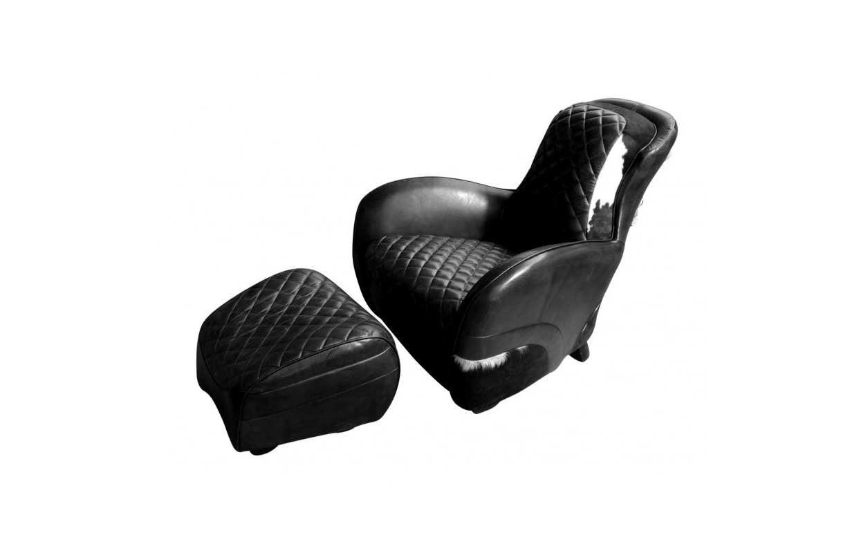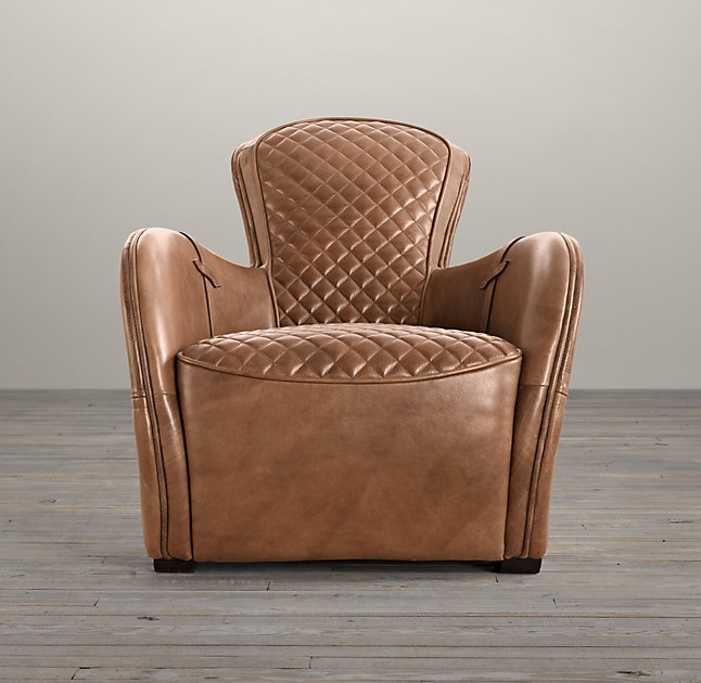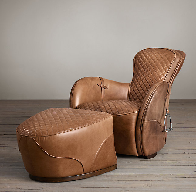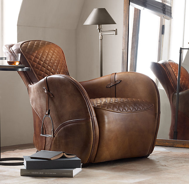 Our chair's equestrian aesthetic is informed by a traditional riding saddle, transformed into a luxurious retreat. Amply padded and swathed in panels of hand-finished leather, it features quilted stitching at the high, angled back and seat, while piping trims the rounded arms.