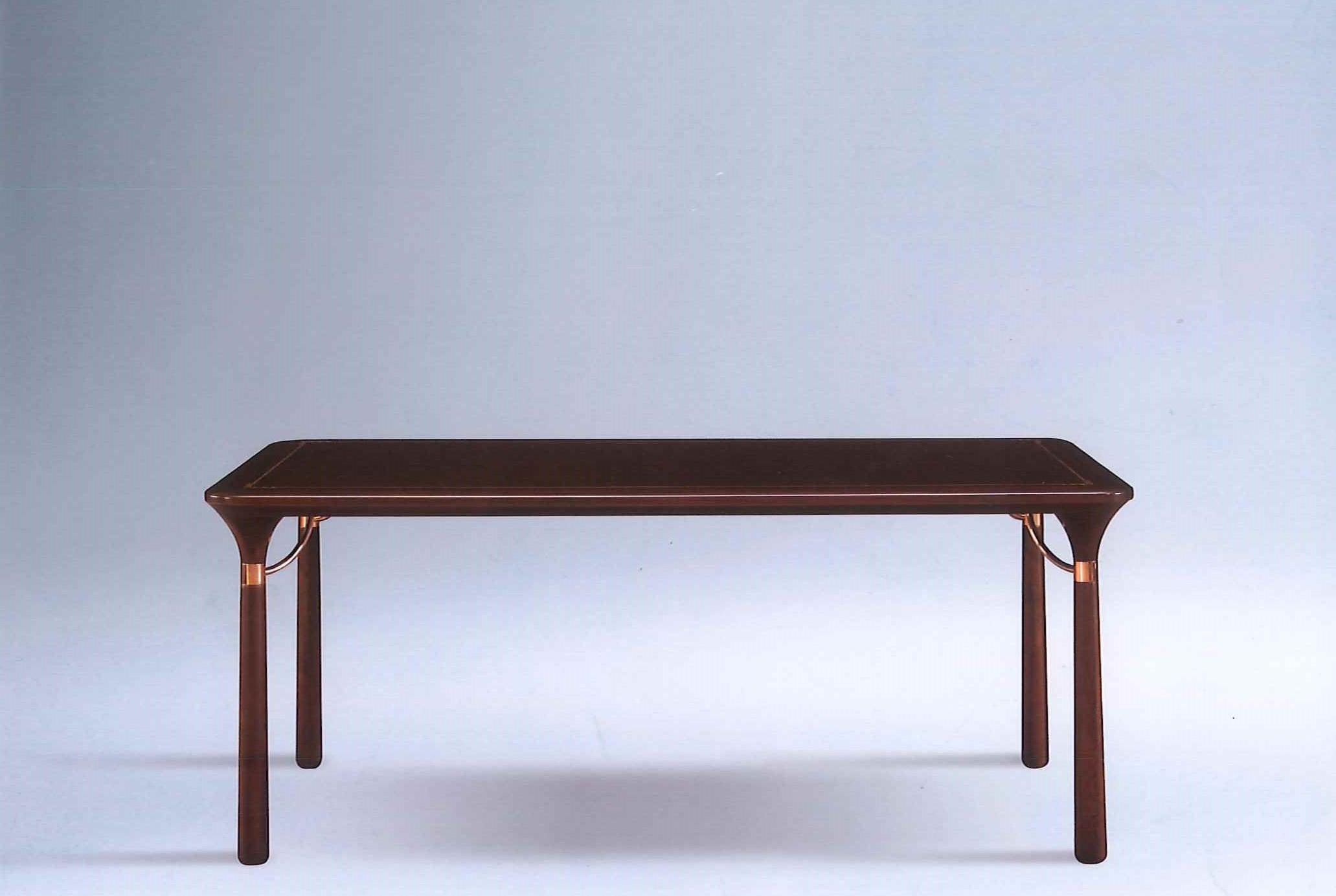 1.餐台造型简洁精巧,源于明式家具形制,以线为主,通透灵动。 2.餐台四角采用中式传统家具中霸王枨造型,同时以铜制装饰,稳固大方,美观典雅。