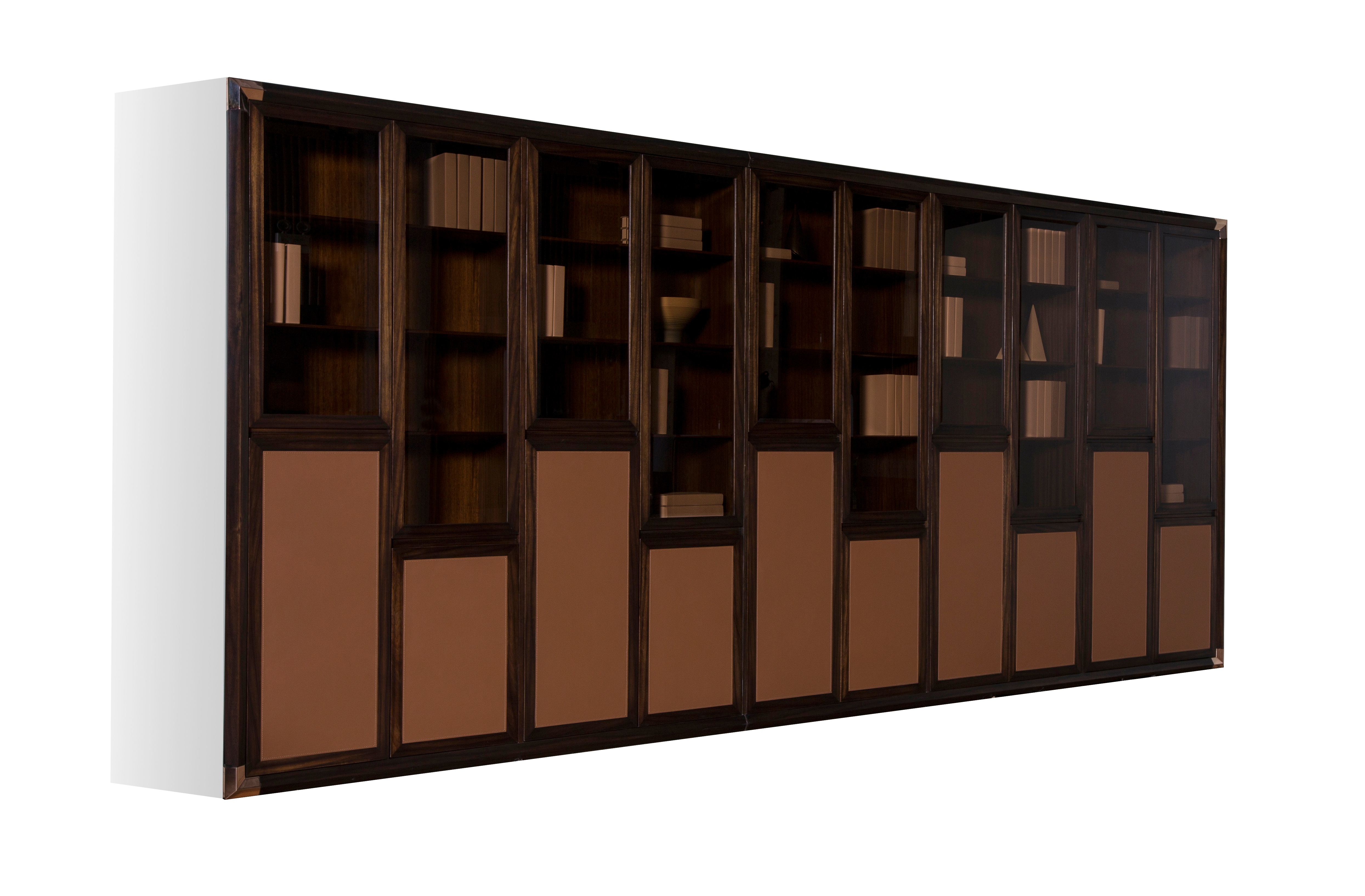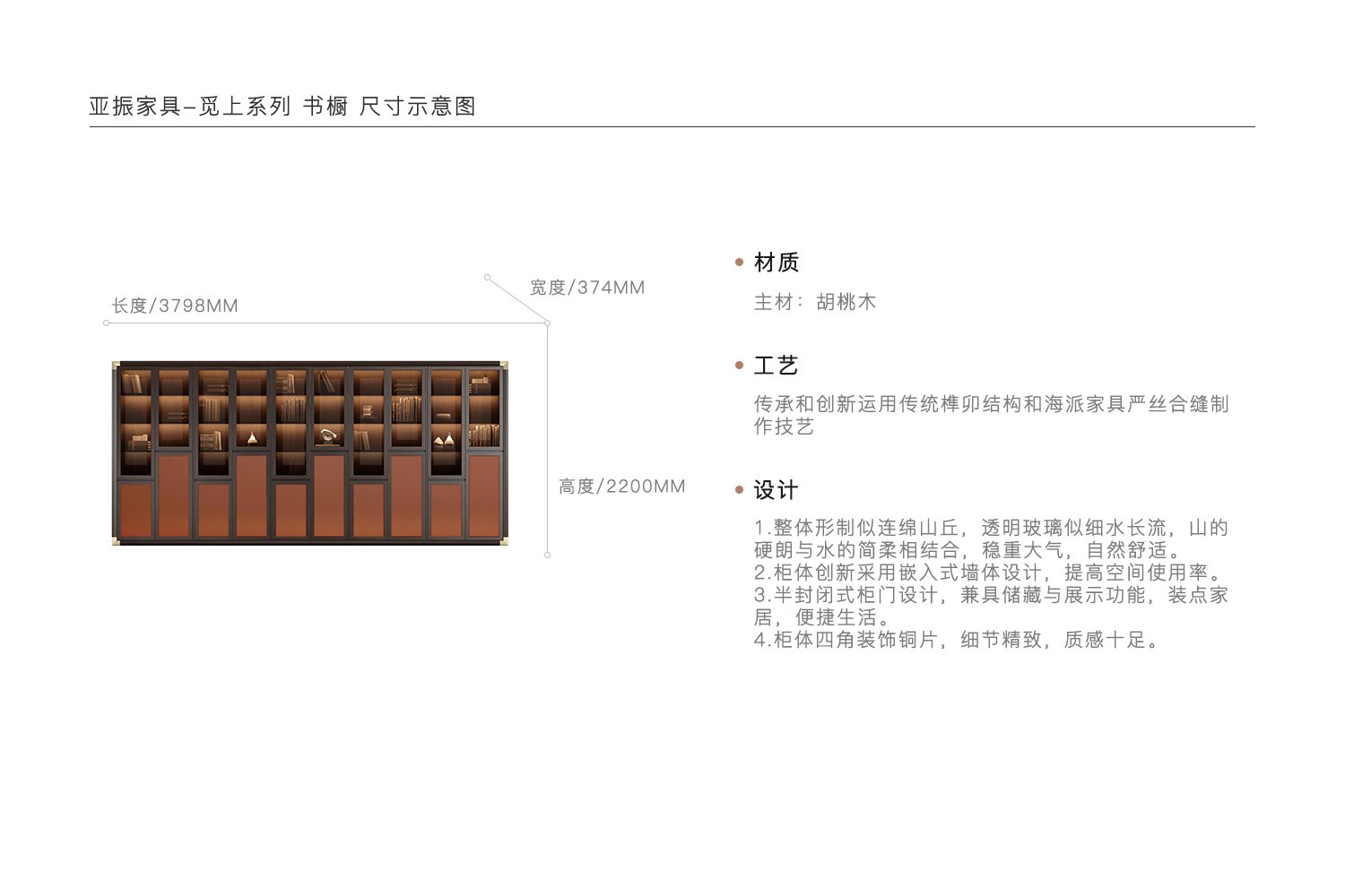 1.整体形制似连绵山丘,透明玻璃似细水长流,山的硬朗与水的简柔相结合,稳重大气,自然舒适。 2.柜体创新采用嵌入式墙体设计,提高空间使用率。 3.半封闭式柜门设计,兼具储藏与展示功能,装点家居,便捷生活。 4.柜体四角装饰铜片,细节精致,质感十足。
