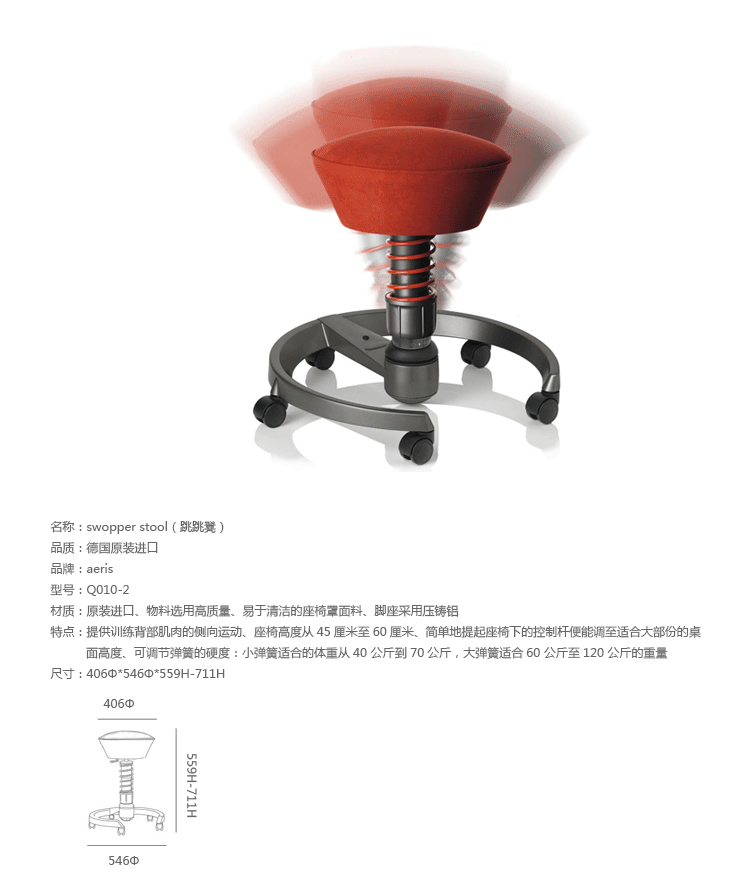 Swopper Stool(跳跳凳)是设计师Henner Jahns别具心裁的设计。椅子物料选用高质量,易于清洁的座椅罩面料:超细纤维面料赋予座椅更多色彩。螺旋弹簧是由精钢制造,使swopper移动时能提升,供稳固而有弹性,独一无二的坐感,您可以根据你的体重分别设置弹簧硬度,脚座采用压铸铝,可选配固定脚或轮子。Swopper Stool(跳跳凳)能让你体验到 “坐”着运动 德国swopper座椅自1997年推出市场以来,以其创新的3d技术,全胜实现使用者向各个方向的运动,彻底颠覆了办公椅市场。其独特的三维运动能让你在办公的同时乐在其中。此座椅在国际设计舞台上屡获殊荣。Swopper Stool(跳跳凳)是以让你坐不踏实为目的而设计的健康办公椅,坐在上面你就需要靠脊椎和背肌保持平衡,如此可达到锻炼脊椎软骨和背肌的作用,并保持大脑的兴奋度。