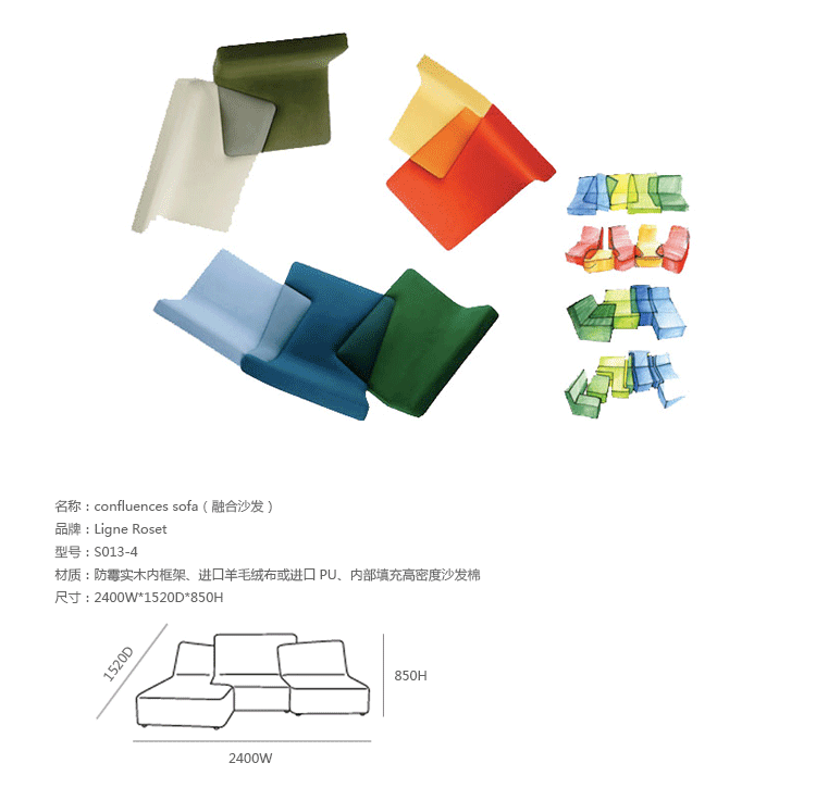 法国写意空间公司(Ligne Roset)在今年的科隆国际家具展上展出了这一款Confluence模块沙发,并获得了最佳设计奖(Best of Best)、最佳项目奖(Best Item)及最佳系列奖(Best System)三个奖项。Confluence模块沙发由法国设计师Philippe Nigro设计,这款沙发非常规的外型构造突显了设计师非凡的想象力和创造力,其相互交汇的构造看上去就像拼图一样充满趣味,而这种造型无疑也会给其陈设空间带来一种新鲜感。Confluence模块沙发可让使用者随其心意而将不同颜色、不同形状的模块搭配成各种组合,这也使其为体型不同,审美有异的各类人群都提供了个性化的就坐方式。设计师的创作灵感来自于现代美术作品中重叠的图形和笔直的线条,而略去了传统家具设计经常遵循的对称原则。Confluence模块沙发由多层木板和焊接钢片作为框架,内部由各种密度的聚醚泡沫材料填充,其表面面料为聚酯纤维织物,沙发脚由黑色聚丙烯制成。Confluence模块沙发各部分间相互重叠与镶嵌的方式令人眼前一亮,实用而有趣,满足了外型的美观而又充分体现了强大的功能,这应该是每件家具都追求的目标吧。