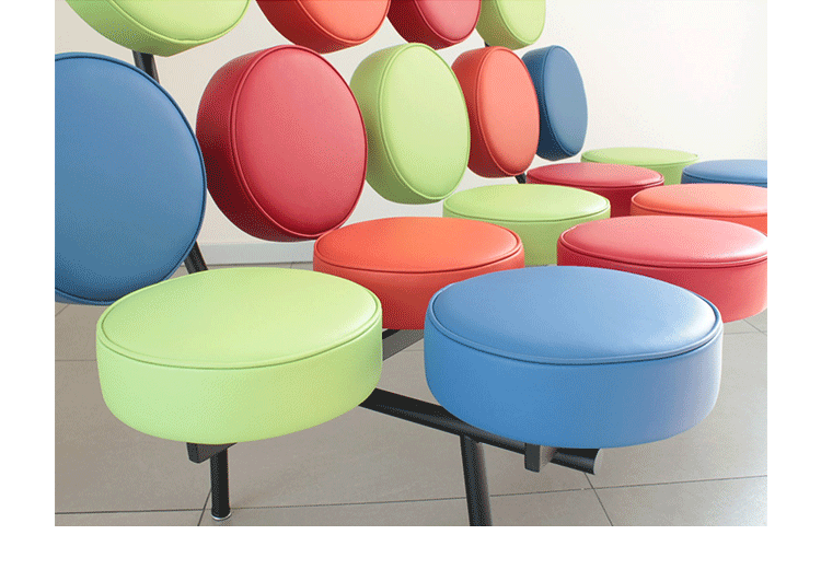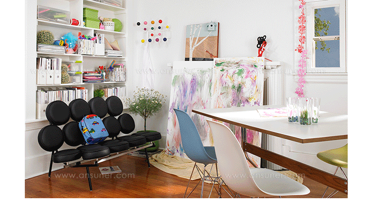 棉花糖沙发,英文名“Marshmallow sofa”,也叫鼓椅、向日葵椅,是设计师George Nelson在1956年设计的,这个设计用18个独立的圆形软垫组成座椅和靠背,“漂浮”在沙发框上。软垫的拆卸十分方便,可轻松完成保洁工作,并可交换各个软垫的位置以保持均匀的使用度,还可选择软垫的颜色,组合出全新的外观,因此很富于游戏感。米勒公司在推出这款产品的时候,说这个沙发是“第一款孕育着全新软椅概念的产品。我们觉得它不仅可以在家里使用,而且可以在与前者环境迥异的公共大厅内使用,它与众不同的外观无疑是公共场合的一道风景线。”软垫的色彩有单一色彩和多种色彩可选,适用范围很广,办公室、大厅、休闲室、客厅或书房等空间都可使用。