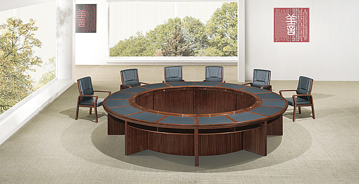 ※ 实木的会议桌由传统的板形基座承托,桌边微弯,与人坚稳厚重之感;外围为弧形的会议条桌!