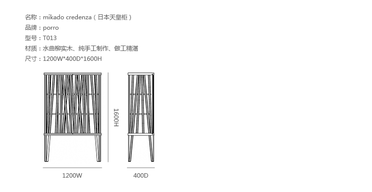 “mikado credenza(日本天皇柜)是一件能吸引人兴趣和好奇心的柜子,有着诱人的亮度与强烈的异国情调,由著名工业设计师Giorgetto Giugiaro所设计。mikado credenza是专为居室所设计,双扇面板平滑开关门,非常具有日式风格,不仅节省空间,而且还非常简便。水曲柳实木纯手工制作,做工精湛。”