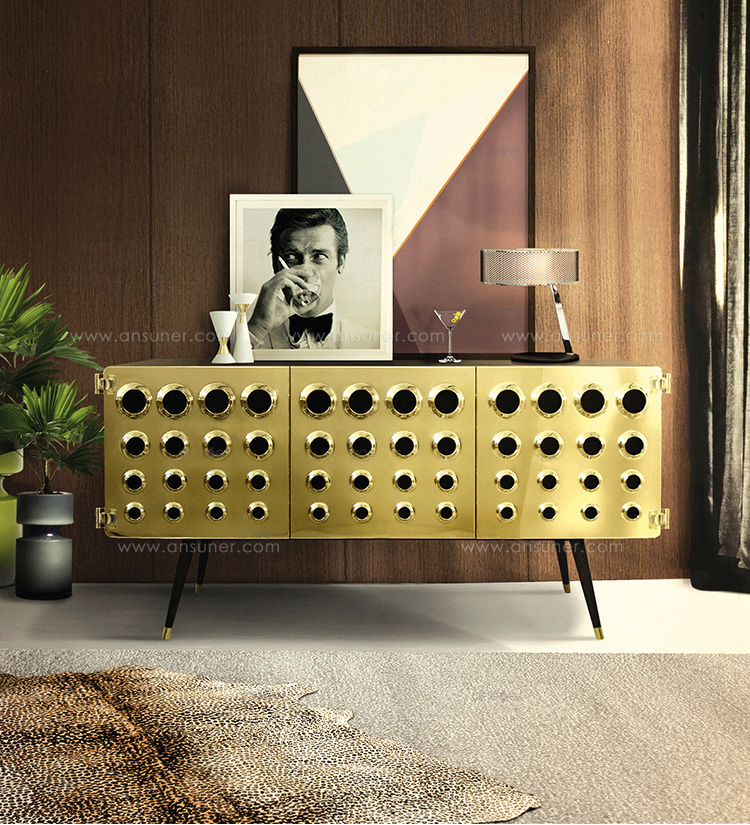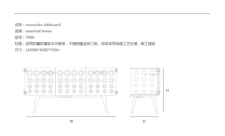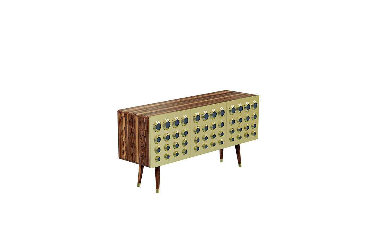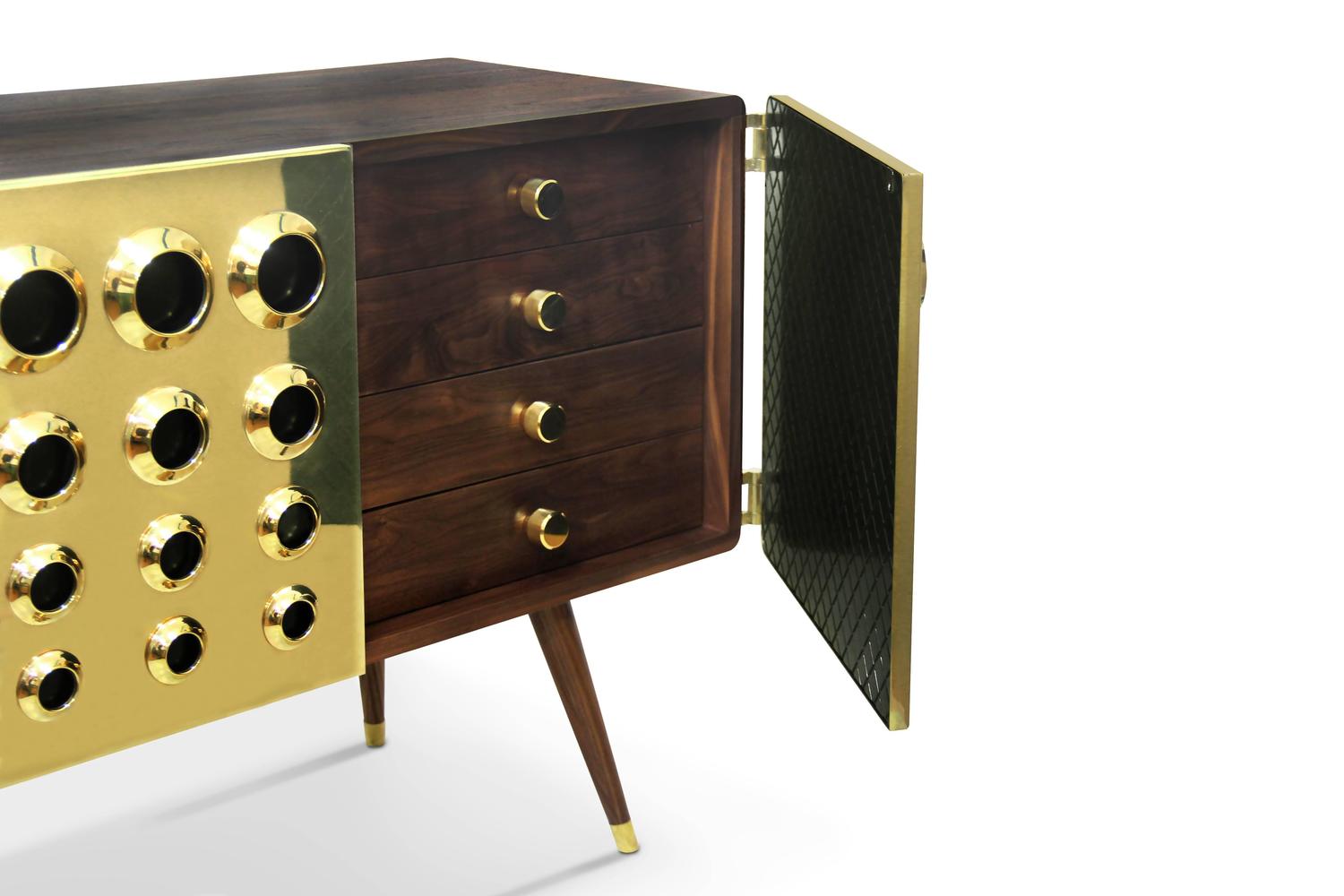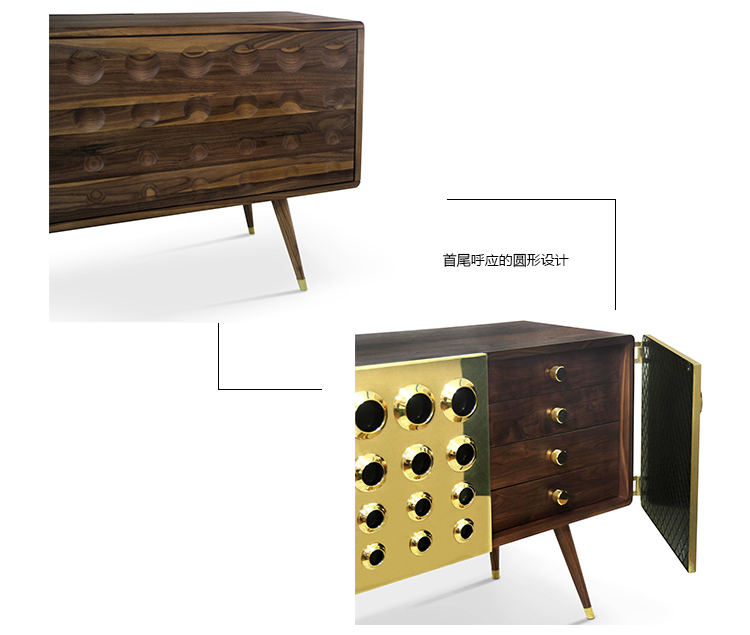 Monocles是侧板完全建立了坚实的胡桃木,重音的镀金黄铜大门,特征突出的圆形设计。这些圆圈,然后刻在单位的背面和侧面,给它一个极端的字符和高端的外观。这是上世纪中期复古爱好者或崇拜者完美的家具,使滚花旋钮在抽屉或锥形腿。