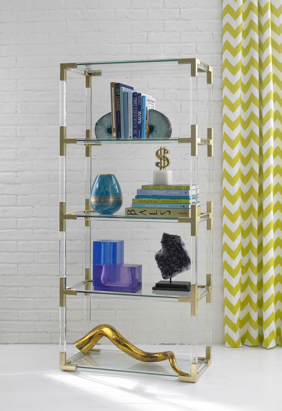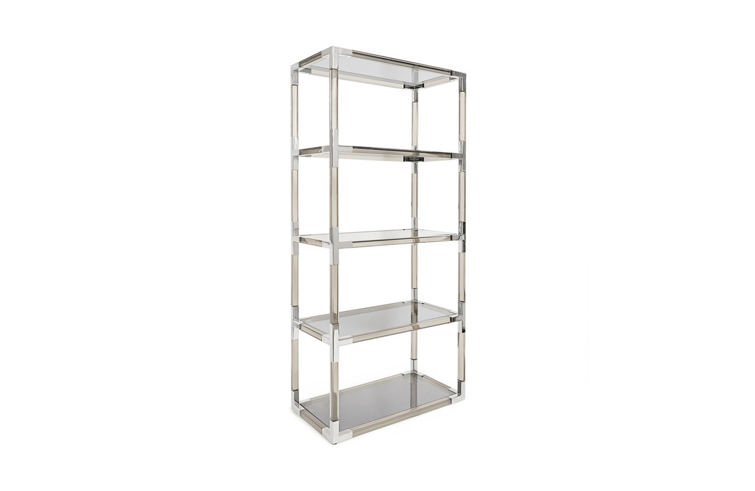 从luxe透明丙烯酸与拉丝黄铜或抛光镍口音,或穆迪烟丙烯酸与抛光镍装饰。为书籍或展示你最喜欢的作品而举行的聚会。