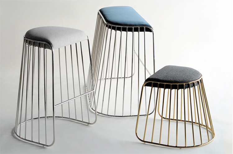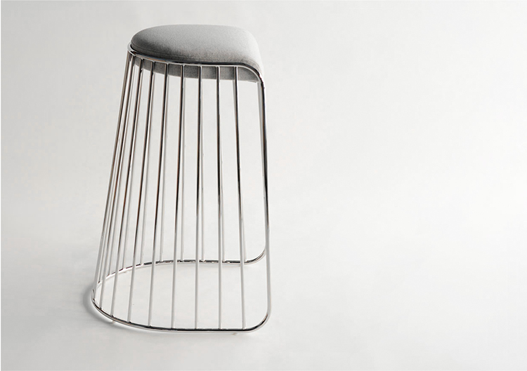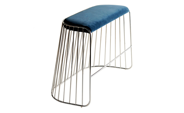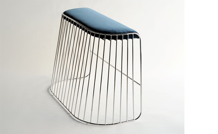 "The Bride's Veil Stool family’s unique language is meant as a graceful alternative to the archetypal bar stool.The double stool is the perfect solution for you and your date to enjoy sitting together uninhibited by separate stools.The strikingly elegant metal base is available in smoked brass,polished chrome, burnt copper,or powder coat,while the top is offered in COM upholstery.At every angle these stools offer a visual treat."