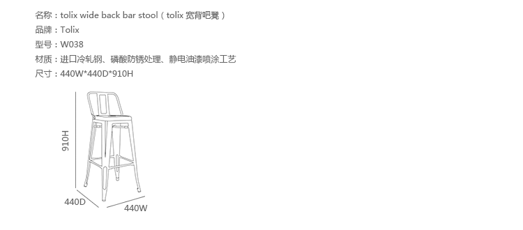 tolix chair(tolix椅)一把有味道、有态度的椅子,据说它最开始被使用在一艘战舰的天气预报房间里,故事的真实性与否不得而知,但是不影响其成为享誉世界的著名设计家具,1934年由Xavier Pauchard设计,早期是作为户外用家具设计,力图展现法式慵懒而闲适的气质,经年而来被全世界时尚设计师所宠爱,从室外扩展到家居、商业、展示等多个用途,而此椅也不负众望在各类空间中均有上佳表现,特别是近年来与混搭、乡村、美式、怀旧、北欧简约、中式等主要装修风格搭配,都呈现出独特的韵味,也被时尚界赞为“百搭第一”椅,可以用在酒吧,餐馆,咖啡馆等等地方,之后通过改进,设计出有扶手版本的tolix armchair(tolix扶手椅),高背版本的tolix high back bar stool(tolix高背吧凳),宽背版本的tolix wide back bar stool(tolix宽背吧凳),及tolix bar stool(tolix吧凳)和tolix mini stool(tolix迷你凳)。制作采用进口冷轧钢、磷酸防锈处理、静电油漆喷涂工艺、坐面为木板或PU海绵坐垫,颜色可选。
