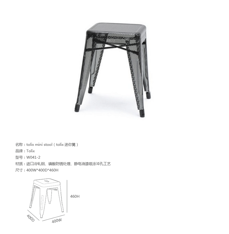 tolix chair(tolix椅)一把有味道、有态度的椅子,据说它最开始被使用在一艘战舰的天气预报房间里,故事的真实性与否不得而知,但是不影响其成为享誉世界的著名设计家具,1934年由Xavier Pauchard设计,早期是作为户外用家具设计,力图展现法式慵懒而闲适的气质,经年而来被全世界时尚设计师所宠爱,从室外扩展到家居、商业、展示等多个用途,而此椅也不负众望在各类空间中均有上佳表现,特别是近年来与混搭、乡村、美式、怀旧、北欧简约、中式等主要装修风格搭配,都呈现出独特的韵味,也被时尚界赞为“百搭第一”椅,可以用在酒吧,餐馆,咖啡馆等等地方,之后通过改进,设计出有扶手版本的tolix armchair(tolix扶手椅),高背版本的tolix high back bar stool(tolix高背吧凳),宽背版本的tolix wide back bar stool(tolix宽背吧凳),及tolix bar stool(tolix吧凳)和tolix mini stool(tolix迷你凳)。制作采用进口冷轧钢、磷酸防锈处理、静电油漆喷涂工艺、坐面为木板或PU海绵坐垫,颜色可选。