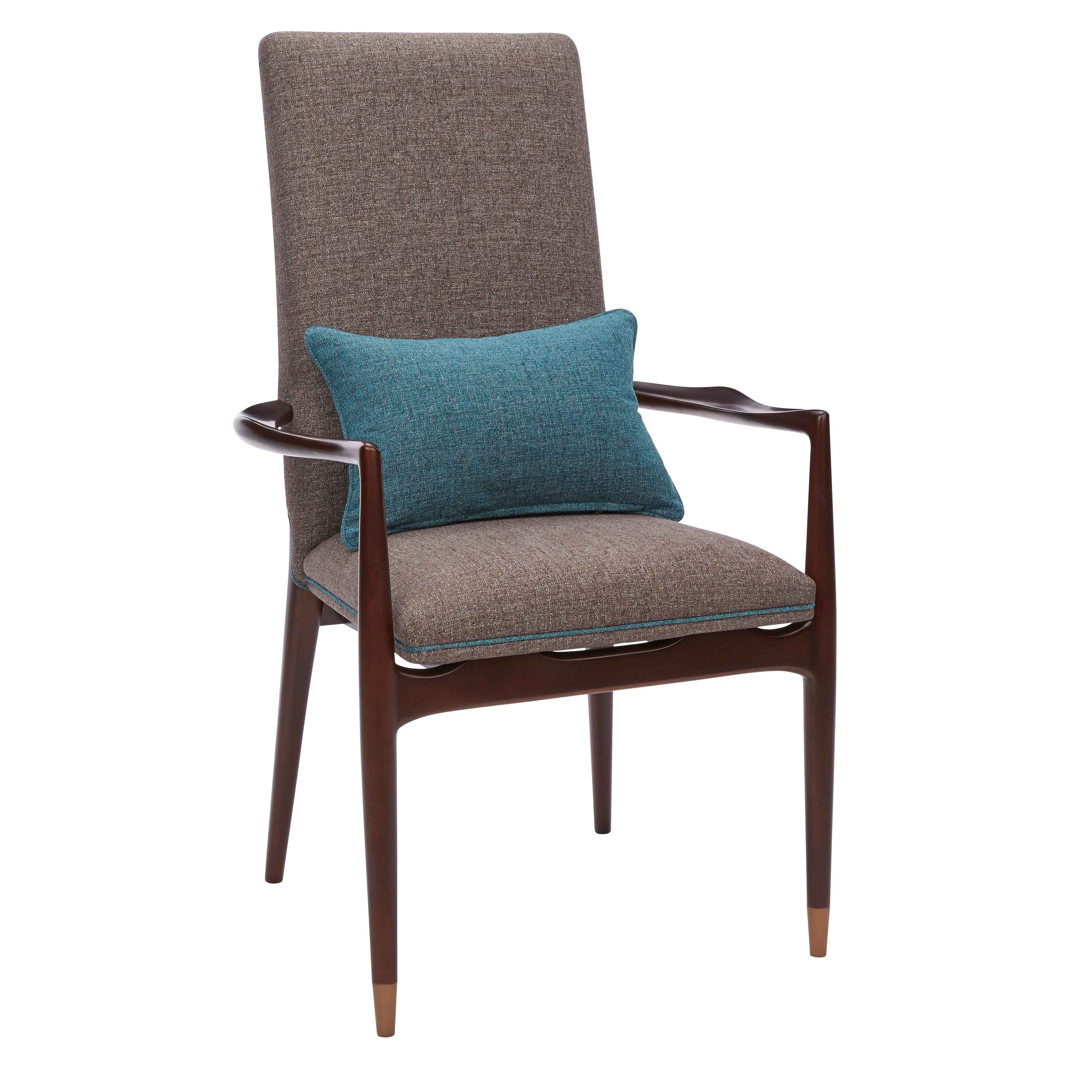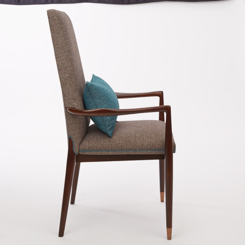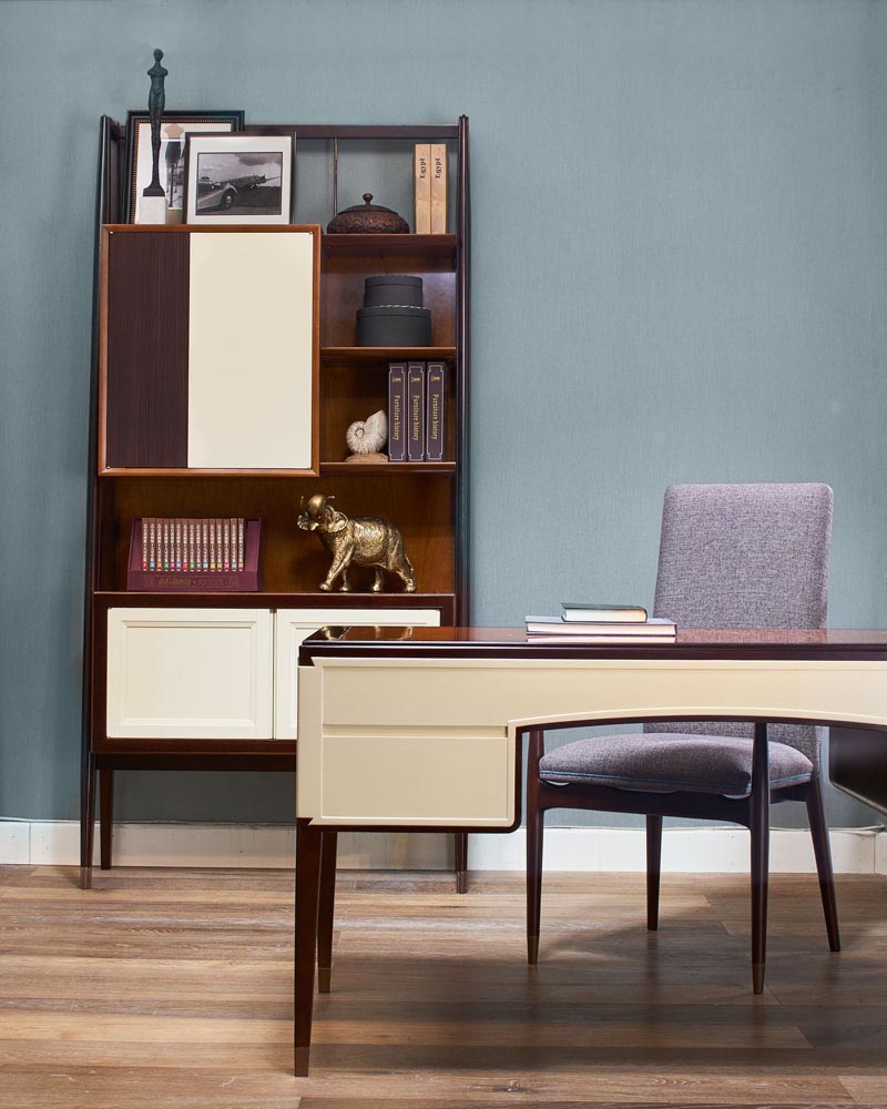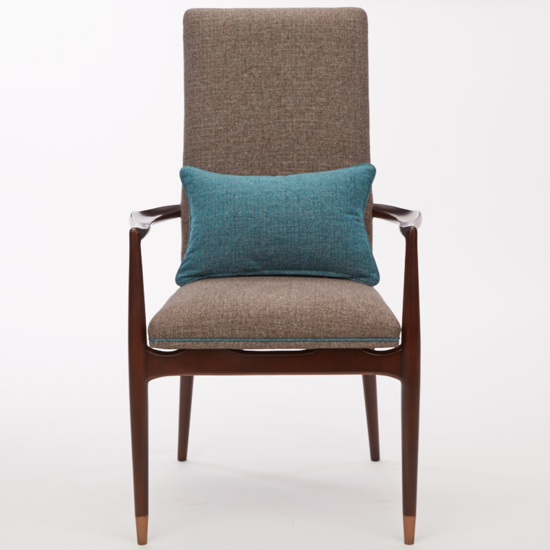布包饰工艺,由经验丰富的技师手工独立完成,确保美观、耐用又符合人体工程学;铜脚,赋予中式韵味的同时以防磨损。圈椅的影子投射在这把写字椅上,简练的线条呈现中国文化的精深。