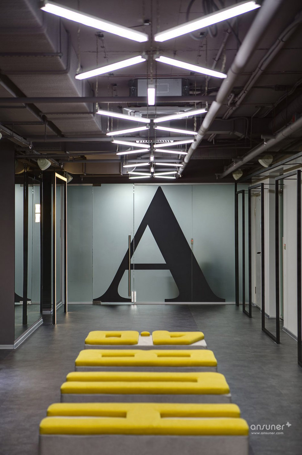 三层主要用作联合办公空间,配有会议室、skype视频聊天室、以及几间专题会议室。这里还配以开放而流动的新闻中心、以及采用接待区的格调布局的商务洽谈区。在这个洋溢着极简工业美学的工作空间里,设计团队运用了大量的创意吸引创业者,如鲜明饱和的色彩点缀、大量的创意图形与文字设计等。